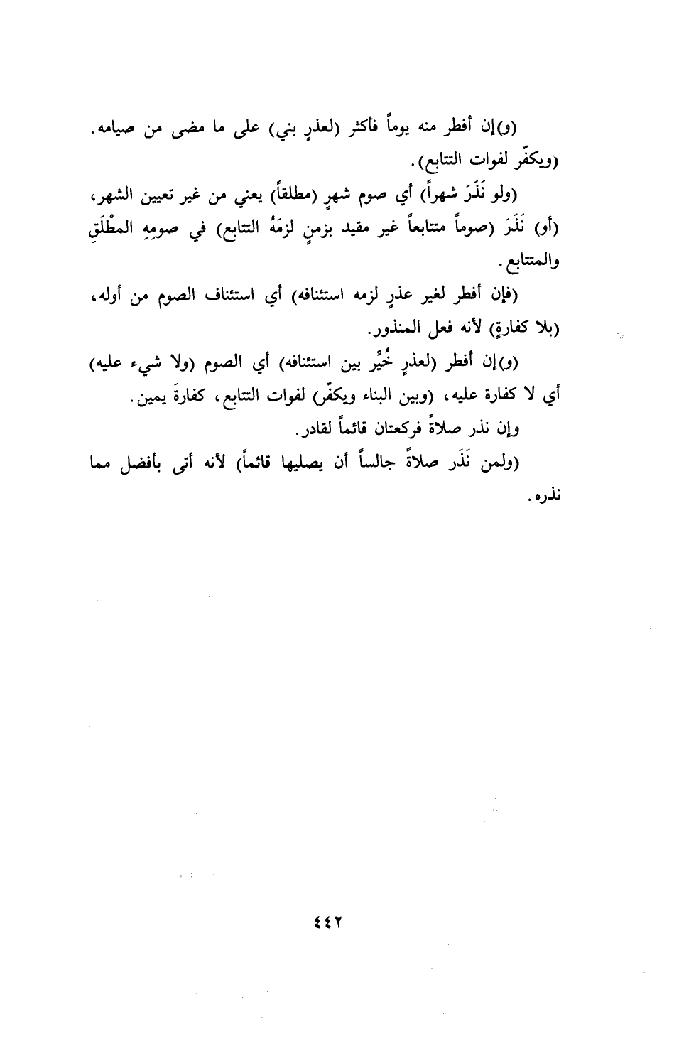 (فإن أفطر لغير عذرٍ لزمه استئنافه) أي استئناف الصوم من أوله، (بلا كفارةٍ) لأنه فعل المنذور.