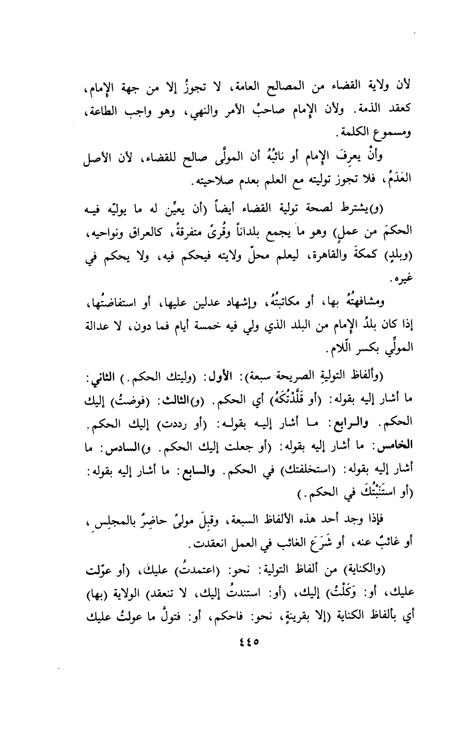 (وألفاظ التوليةِ الصريحة سبعة): الأول: (وليتك الحكم.) الثاني: ما أشار إليه بقوله: (أو قَلَّدْتُكَهُ) أي الحكم. (و) الثالث: (فوضتُ) إليك الحكم. والرابع: ما أشار إليه بقوله: (أو رددت) إليك الحكم. الخامس: ما أشار إليه بقوله: (أو جعلت إليك الحكم. و) السادس: ما أشار إليه بقوله: (استخلفتك) في الحكم. والسابع: ما أشار إليه بقوله: (أو استَنَبْتُكَ في الحكم.)