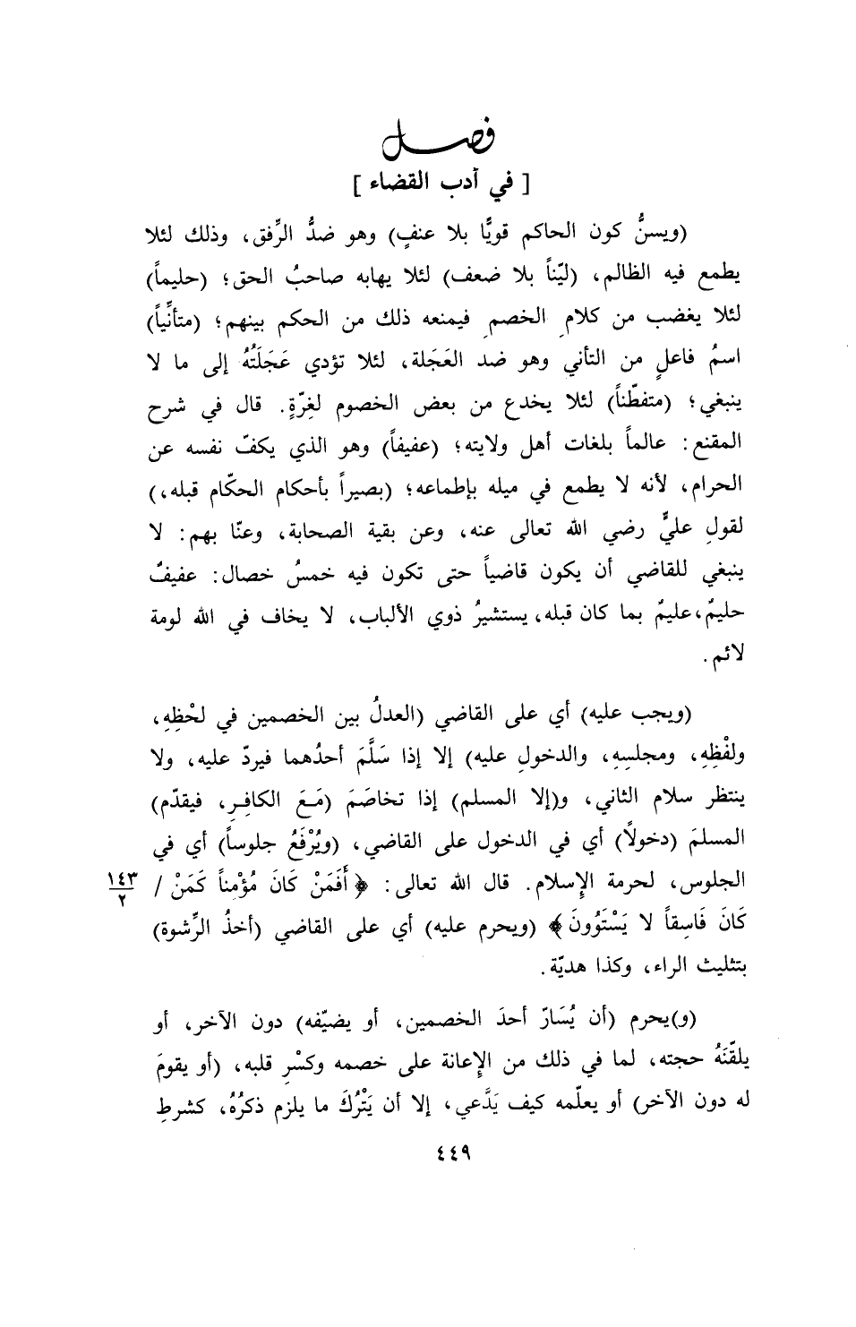 (ويجب عليه) أي على القاضي (العدلُ بين الخصمين في لحْظِهِ، ولفْظِهِ، ومجلسِهِ، والدخولِ عليه) إلا إذا سَلّمَ أحدُهما فيردّ عليه، ولا ينتظر سلام الثاني، و (إلا المسلم) إذا تخاصَمَ (مَعَ الكافِرِ، فيقدّم) المسلمَ (دخولاً) أي في الدخول على القاضي، (ويُرْفَعُ جلوساً) أي في الجلوس، لحرمة الإِسلام. قال الله تعالى: {أَفَمَنْ كَانَ مُؤْمِنًا كَمَنْ كَانَ فَاسِقًا لَا يَسْتَوُونَ} (ويحرم عليه) أي على القاضي (أخذُ الرِّشوة) بتثليث الراء، وكذا هديّة.