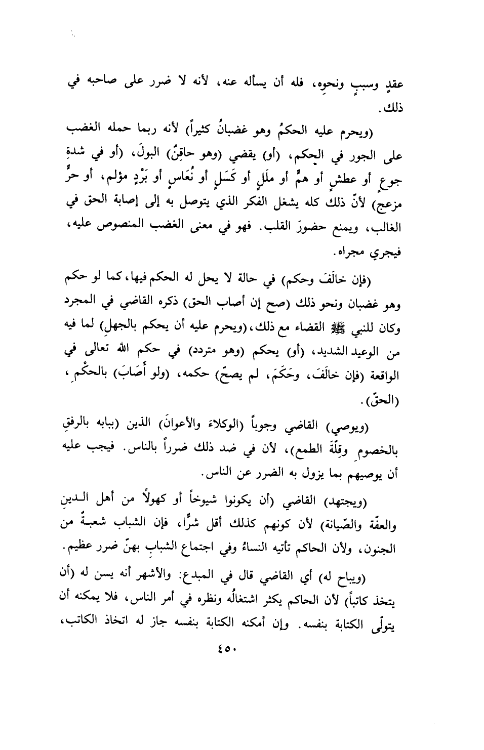 (ويحرم عليه الحكمُ وهو غضبانُ كثيراً) لأنه ربما حمله الغضب على الجور في الحكم، (أو) يقضي (وهو حاقِنٌ) البولَ، (أو في شدةِ جوعٍ أو عطشٍ أو همٍّ أو ملَلٍ أو كَسَلٍ أو نُعَاسٍ أو بَرْدٍ مؤلم، أو حرٍّ مزعج) لأنّ ذلك كله يشغل الفكر الذي يتوصل به إلى إصابة الحق في الغالب، ويمنع حضورَ القلب. فهو في معنى الغضب المنصوص عليه، فيجري مجراه.