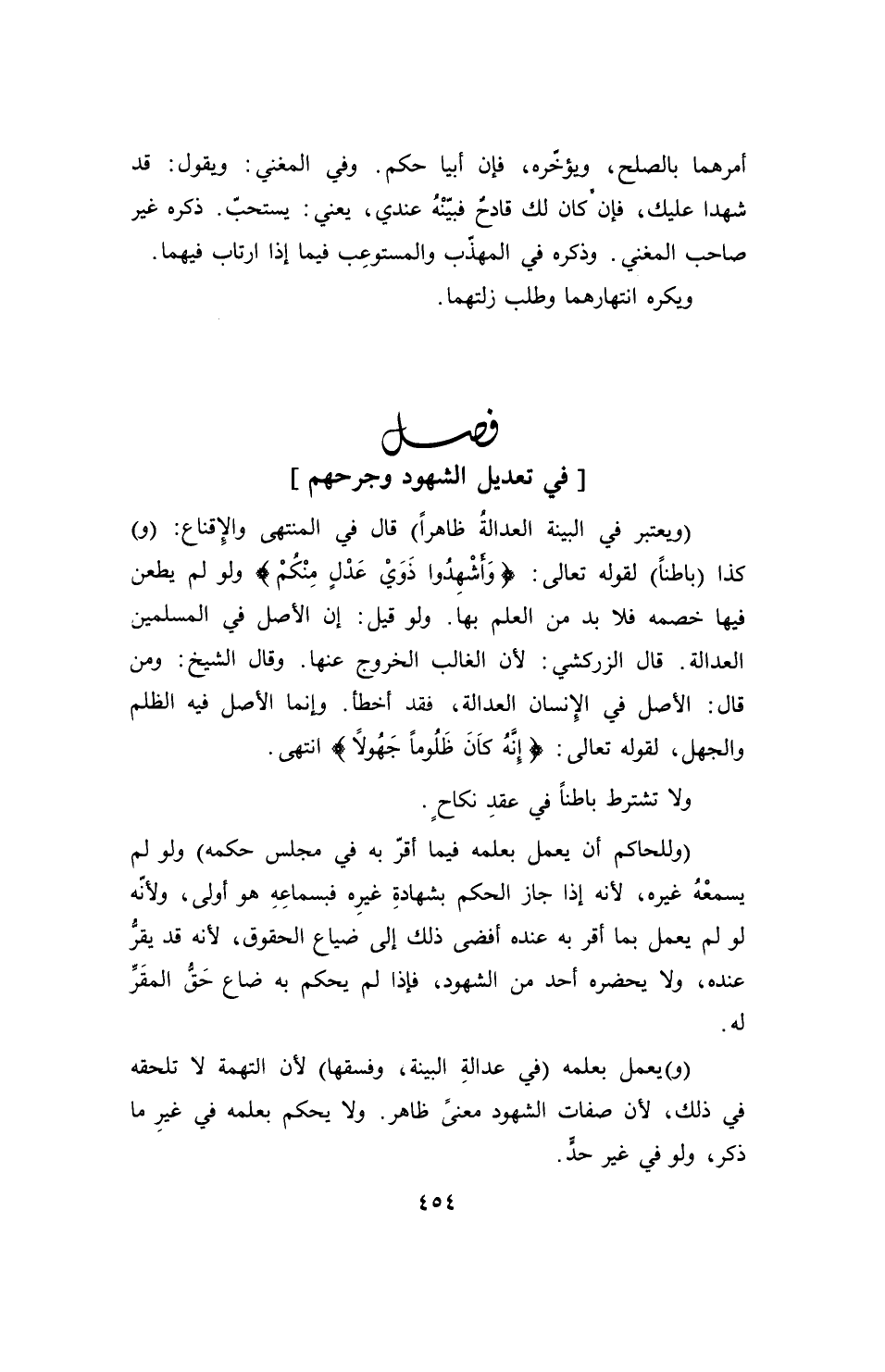 (ويعتبر في البينة العدالةُ ظاهراً) قال في المنتهى والإِقناع: (و) كذا (باطناً) لقوله تعالى: {وَأَشْهِدُوا ذَوَيْ عَدْلٍ مِنْكُمْ} ولو لم يطعن فيها خصمه فلا بد من العلم بها. ولو قيل: إن الأصل في المسلمين العدالة. قال الزركشي: لأن الغالب الخروج عنها. وقال الشيخ: ومن قال: الأصل في الإِنسان العدالة، فقد أخطأ. وإنما الأصل فيه الظلم والجهل، لقوله تعالى: {إِنَّهُ كَانَ ظَلُومًا جَهُولاً} انتهى.
