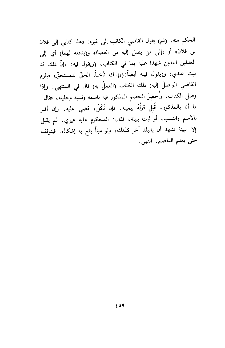 الحكم منه، (ثم) يقول القاضي الكاتب إلى غيره: "هذا كتابي إلى فلان بن فلان" أو "إلى من يصل إليه من القضاة" و (يدفعه لهما) أي إلى العدلين اللذين شهدا عليه بما في الكتاب، (ويقول فيه: "إنّ ذلك قد ثبت عندي" و) يقول فيه أيضاً: ("إنك تأخذُ الحق للمستحقّ" فيلزم القاضي الواصلَ إليه) ذلك الكتاب (العملُ به) قال في المنتهى: وإذا وصل الكتاب، وأُحضِرَ الخصم المذكور فيه باسمه ونسبه وحليته، فقال: ما أنا بالمذكور، قُبِل قولُهُ بيمينه. فإن نَكَلَ، قضي عليه. وإن أقر بالاسم والنسب، أو ثبت ببينة، فقال: المحكوم عليه غيري، لم يقبل إلا ببينة تشهد أن بالبلد آخر كذلك، ولو ميتاً يقع به إشكال. فيتوقف حتى يعلم الخصم. انتهى.