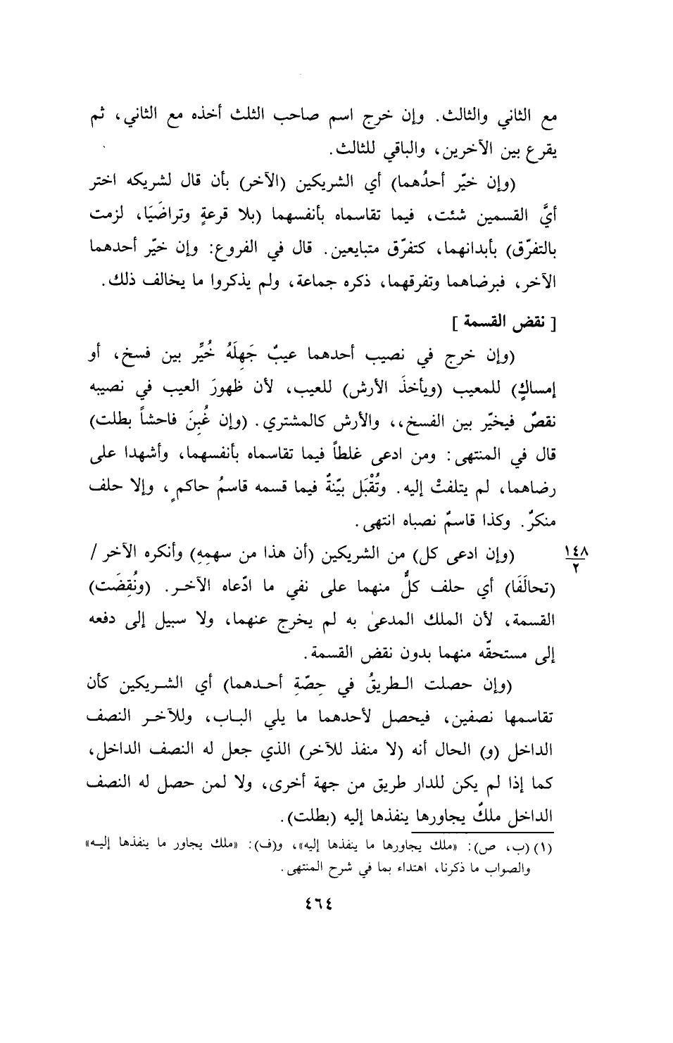 (وإن ادعى كل) من الشريكين (إن هذا من سهمهِ) وأنكره الآخر (تحالَفَا) أي حلف كلٌّ منهما على نفي ما ادَّعاه الآخر. (ونُقِضَت) القسمة، لأن الملك المدعى به لم يخرج عنهما، ولا سبيل إلى دفعه إلى مستحقّه منهما بدون نقض القسمة.