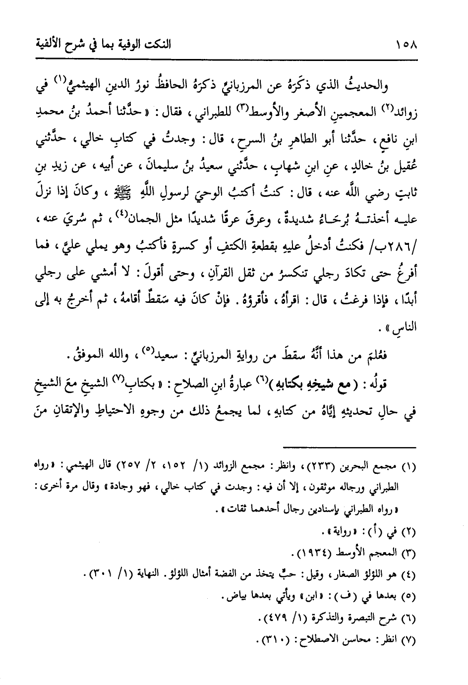 والحديثُ الذي ذكَرَهُ عن المرزبانيِّ ذكرَهُ الحافظُ نورُ الدينِ الهيثميُّ (¬1) في زوائد (¬2) المعجمينِ الأصغر والأوسط (¬3) للطبراني، فقال: ((حدَّثنا أحمدُ بنُ محمدِ ابنِ نافعٍ، حدَّثنا أبو الطاهرِ بنُ السرحِ، قال: وجدتُ في كتابِ خالي، حدَّثني عقيل بنُ خالدٍ، عنِ ابنِ شهابٍ، حدَّثني سعيدُ بنُ سليمانَ، عن أبيه، عن زيدِ بنِ ثابتٍ - رضي الله عنه -، قال: كنتُ أكتبُ الوحيَ لرسولِ اللهِ - صلى الله عليه وسلم - وكانَ إذا نزلَ عليه أخذتهُ بُرحَاءُ شديدةٌ، وعرقَ عرقاً شديداً مثل الجمان (¬4)، ثم سُريَ عنه / 286ب /، فكنتُ أدخلُ عليهِ بقطعةِ الكتفِ أو كسرةٍ فأكتبُ وهو يملي عليَّ، فما أفرغُ حتى تكادُ رِجلي تنكسرُ من ثقل القرآنِ، وحتى أقولَ: لا أمشي على رِجلي أبداً، فإذا فرغتُ، قال: اقرأهُ، فأقرؤهُ، فإنْ كانَ فيه سَقطٌ أقامهُ، ثم أخرجُ به إلى الناسِ)).