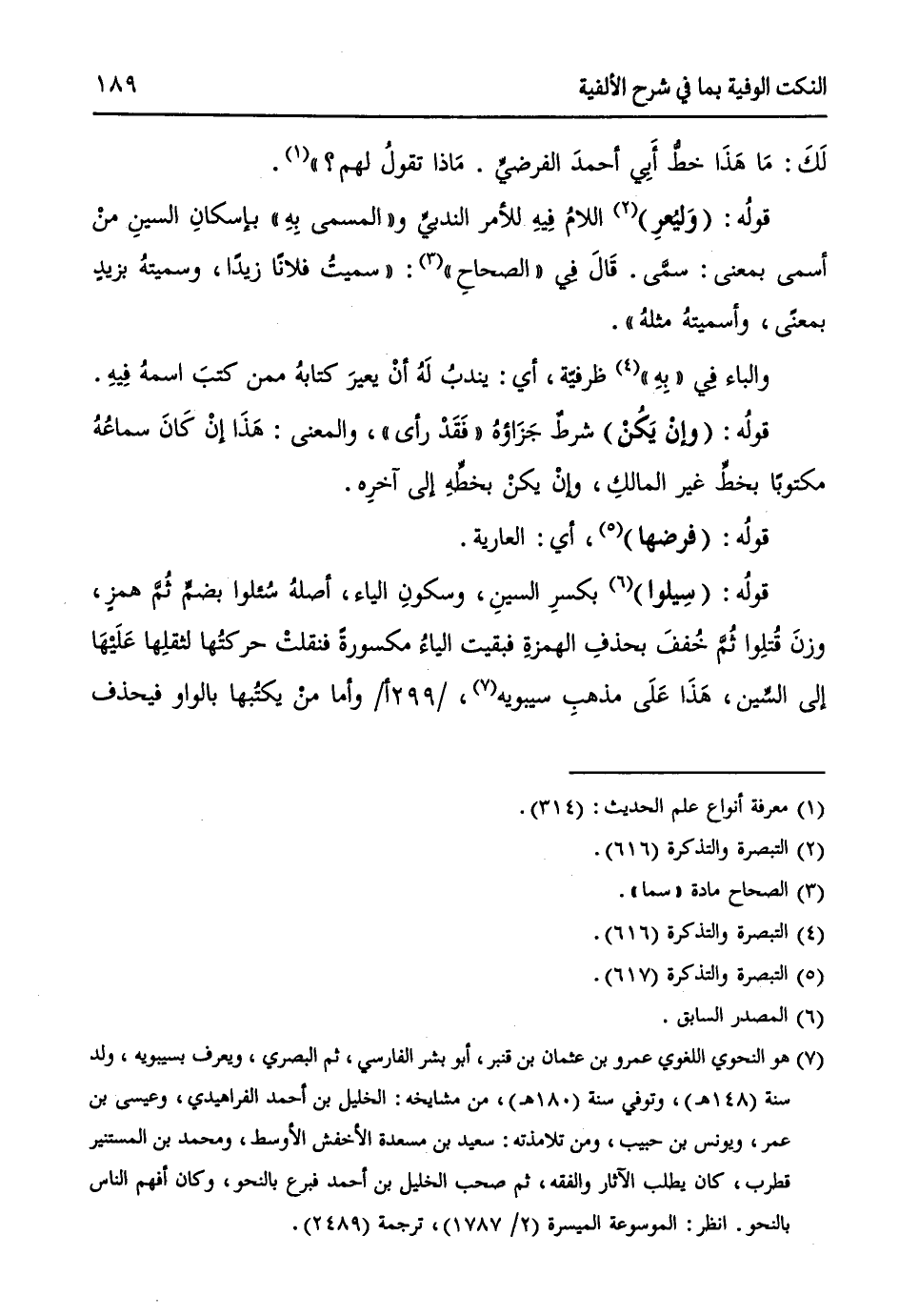 (¬7) هو النحوي اللغوي عمرو بن عثمان بن قنبر، أبو بشر الفارسي، ثم البصري ويعرف بسيبويه ولد سنة (148 هـ)، وتوفي سنة (180 هـ)، من مشايخه: الخليل بن أحمد الفراهيدي، وعيسى بن عمر، ويونس بن حبيب، ومن تلامذته: سعيد بن مسعدة الأخفش الأوسط، ومحمد بن المستنير قطرب، كان يطلب الآثار والفقه، ثم صحب الخليل بن أحمد فبرع بالنحو، وكان أفهم الناس بالنحو. انظر: الموسوعة الميسرة 2/ 1787 ترجمة (2489).
