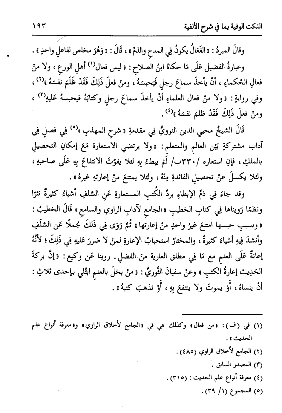 وقد جاءَ فِي ذمِ الإبطاءِ بردِّ الكُتبِ المستعارةِ عَنِ السَّلفِ أشياءُ كثيرةٌ نثراً ونظماً رَويناها فِي كتابِ الخطيبِ "الجامعُ لآدابِ الراوي والسامعِ" قَالَ الخطيبُ: ((وبسببِ حبسِها امتنعَ غيرُ واحدٍ منْ إعارتها)) ثُمَّ رَوَى فِي ذَلِكَ جُملاً عَن السَّلَفِ وأنشدَ فِيهِ أشياءَ كثيرةً، والمختارُ استحبابُ الإعارةِ لمنْ لا ضررَ عَليهِ فِي ذَلِكَ؛ لأنَّهُ إعانةٌ عَلَى العلمِ مع مَا فِي مطلق العارية منَ الفضلِ. روينا عَن وكيع: ((إنَّ بركةَ الحَدِيْث إعارةُ الكتبِ)) وعنْ سفيانَ الثَوريِّ: ((منْ بخلَ بالعلمِ ابتُلي بإحدى ثلاثٍ: أنْ ينساهُ، أَوْ يموتَ ولا ينتفعُ بِهِ، أَوْ تذهبَ كتبهُ)).