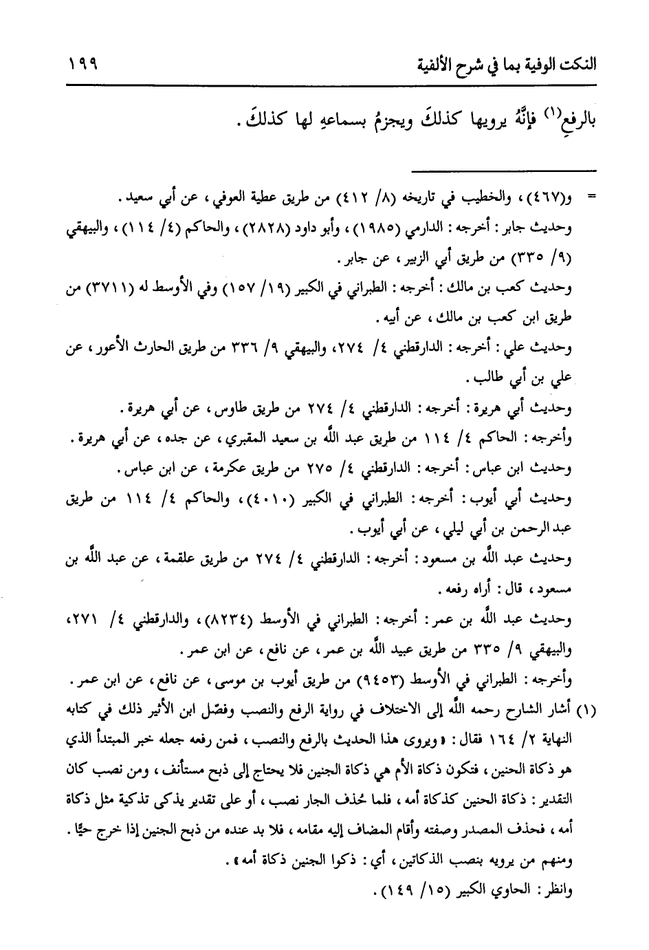 (¬1) أشار الشارح رحمه الله إلى الاختلاف في رواية الرفع والنصب وفصّل ابن الأثير ذلك في كتابه النهاية 2/ 164 فقال: ((ويروى هذا الحديث بالرفع والنصب، فمن رفعه جعله خبر المبتدأ الذي هو ذكاة الجنين، فتكون ذكاة الأم هي ذكاة الجنين فلا يحتاج إلى ذبح مستأنف، ومن نصب كان التقدير: ذكاة الجنين كذكاة أمه، فلما حُذِفَ الجارُ نُصِبَ، أو على تقدير يذكى تذكيةً مثل ذكاة أمه، فحذف المصدر وصفته وأقام المضاف إليه مقامه، فلا بد عنده من ذبح الجنين إذا خرج حياً. ومنهم من يرويه بنصب الذَّكاتين، أي: ذكوا الجنين ذكاةَ أمه)).