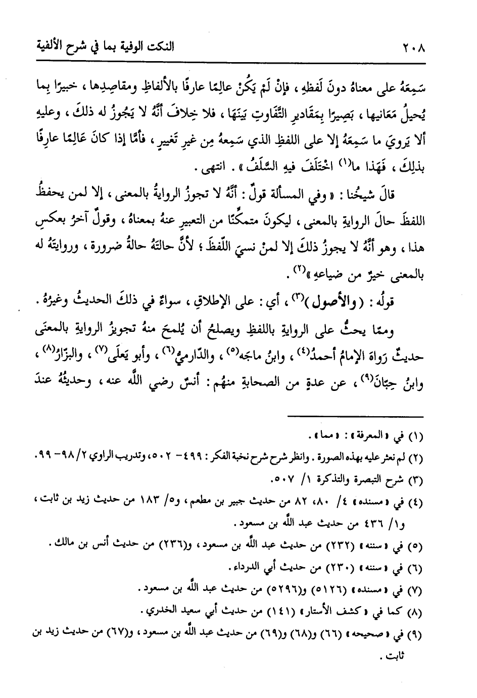 سَمِعَهُ على معناهُ دونَ لَفظهِ، فإنْ لَمْ يَكُنْ عالِماً عارفاً بالألفاظِ ومقاصِدِها، خبيراً بِما يُحيلُ مَعَانِيها، بَصِيْراً بِمَقَاديرِ التَّفَاوتِ بَينَهَا، فلا خِلافَ أنَّهُ لا يَجُوزُ له ذلكَ، وعليهِ أنْ لا يَرويَ ما سَمِعَهُ إلا على اللفظِ الذي سَمِعهُ مِن غيرِ تَغييرٍ. فأمَّا إذا كانَ عَالِماً عارِفاً بذلِكَ، فَهَذا ما (¬1) اخْتَلَفَ فيهِ السَّلَفُ)). انتهى.