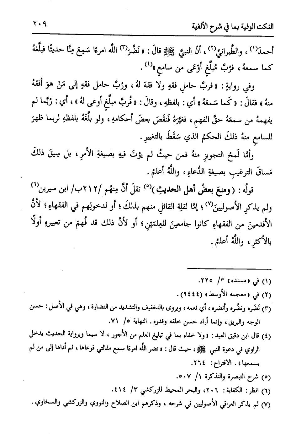 (¬4) قال ابن دقيق العيد: ((ولا خفاء بما في تبليغ العلم من الأجور لاسيما، وبرواية الحديث يدخل الراوي في دعوة النبي - صلى الله عليه وسلم -، حيث قال: ((نضر الله امرءاً سمعَ مقالتي فوعَاها، ثم أدّاها إلى مَنْ لم يسمعها)))). الاقتراح: 264.