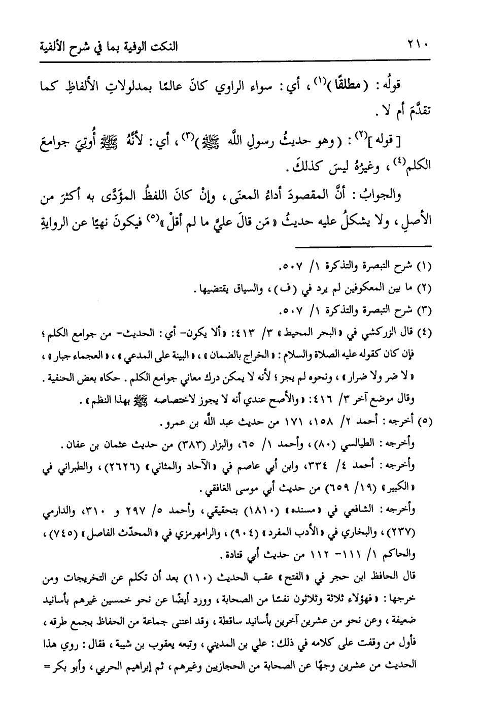 (¬4) قال الزركشي في " البحر المحيط " 3/ 413: ((أن لا يكون - أي: الحديث - من جوامع الكلم؛ فإن كان كقوله عليه الصلاة والسلام: ((الخراج بالضمان))، ((البينة على المدعي))، ((العجماء جبار))، ((لا ضرر ولا ضرار))، ونحوه لم يجز؛ لأنّه لا يمكن درك معاني جوامع الكلم حكاه بعض الحنفية)) وقال في موضع آخر 3/ 416: ((والأصح عندي أنّه لا يجوز لاختصاصه - صلى الله عليه وسلم - بهذا النظم)).