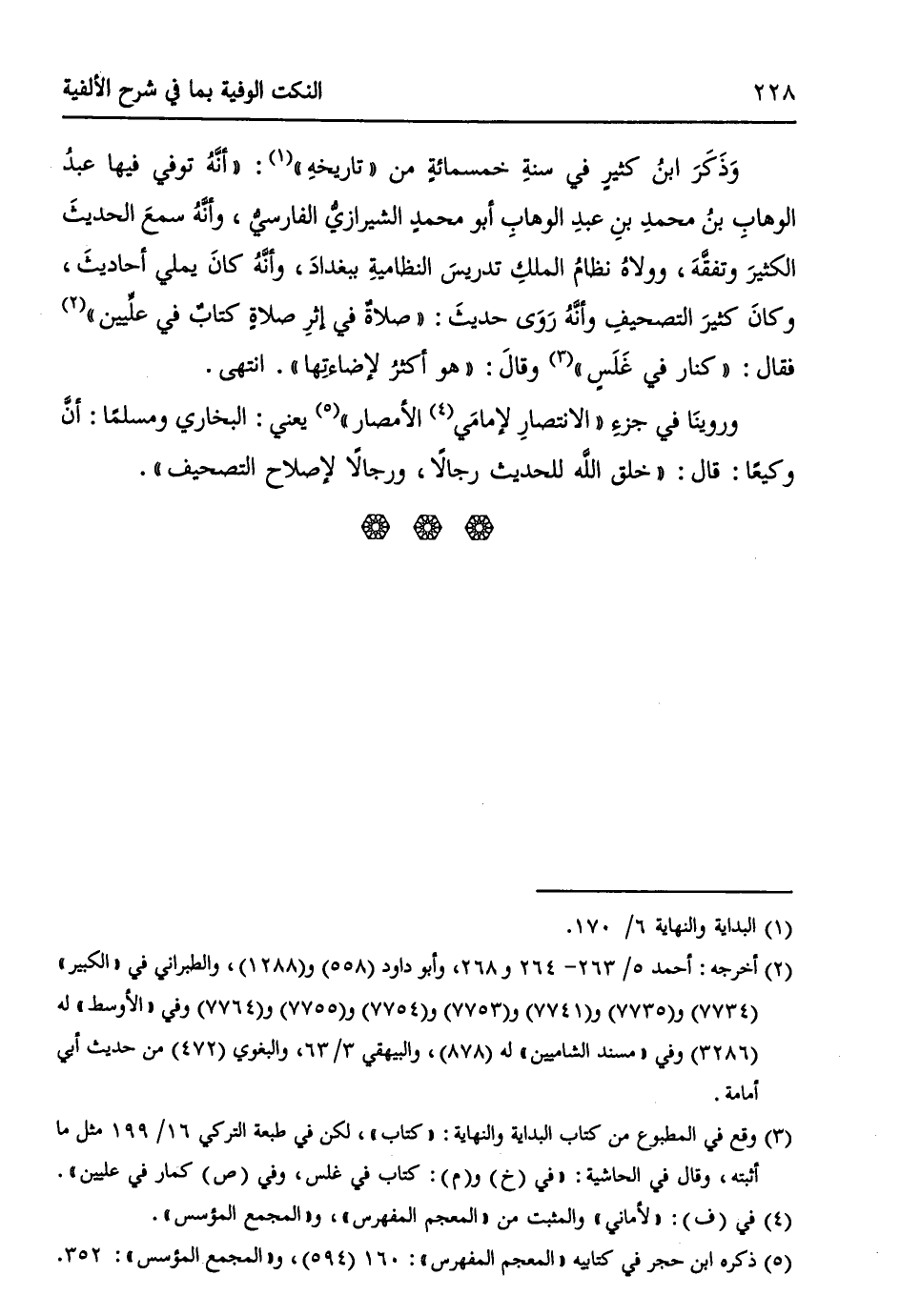 وَذَكَرَ ابنُ كثيرٍ في سنةِ خمسمئةٍ من " تاريخهِ " (¬1): ((أنَّهُ توفي فيها عبدُ الوهابِ بنُ محمدِ بنِ عبدِ الوهابِ أبو محمدٍ الشيرازيُّ الفارسيُّ وأنَّهُ سمعَ الحديثَ الكثيرَ وتفقَّهَ، وولاهُ نظامُ الملكِ تدريسَ النظاميةِ ببغدادَ، وأنَّهُ كانَ يملي أحاديثَ، وكانَ كثيرَ التصحيفِ وأنَّهُ رَوَى حديثَ: ((صلاةٌ في إثرِ صلاةٍ كتابٌ في علِّيين)) (¬2) فقال: ((كنار في غَلَسٍ)) (¬3) وقالَ: ((هو أكثرُ لإضائتِها)). انتهى.