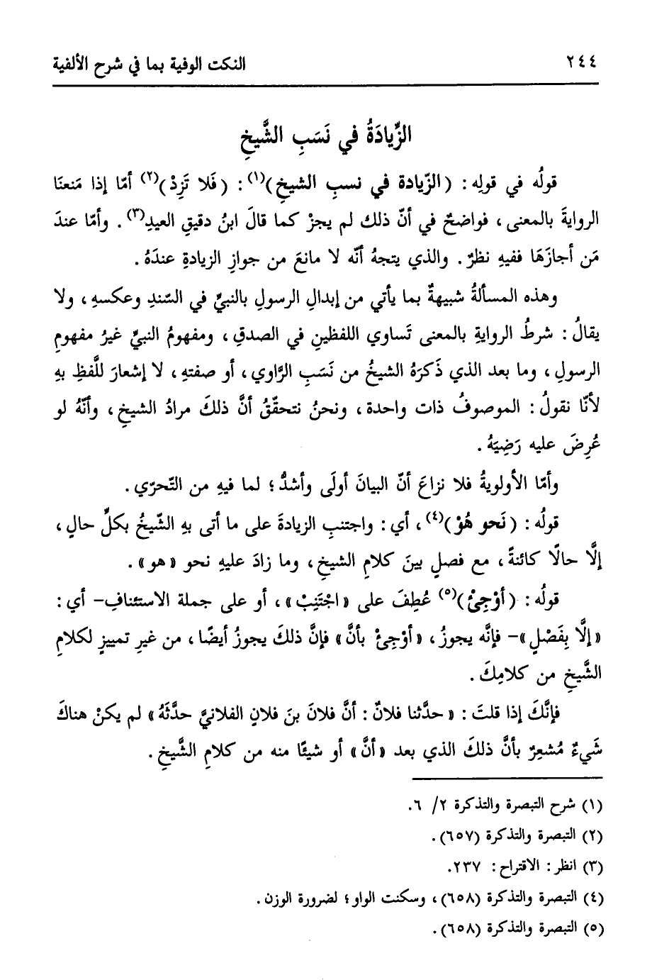 قولهُ في قولهِ: (الزّيادة في نسبِ الشيخِ) (¬1): (فَلا تَزِدْ) (¬2) أمّا إذا مَنعنَا الروايةَ بالمعنى، فواضحٌ في أنّ ذلك لم يجزْ كما قالَ ابنُ دقيقِ العيدِ (¬3). وأمّا عندَ مَن أجازَهَا ففيهِ نظرٌ. والذي يتجهُ أنّه لا مانعَ من جوازِ الزيادةِ عندَهُ.