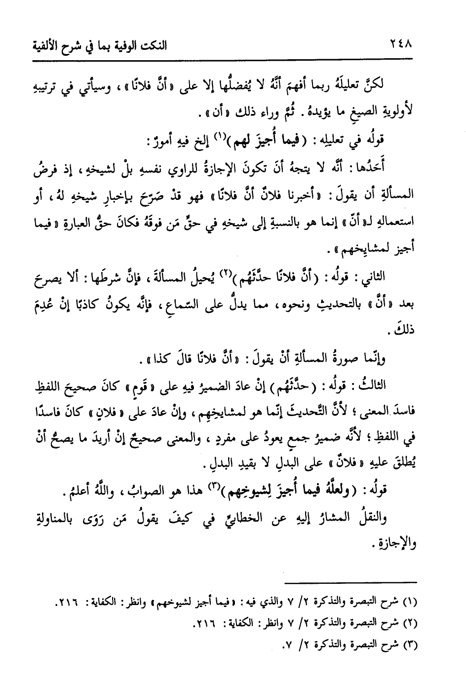 (¬1) شرح التبصرة والتذكرة 2/ 7، والذي فيه: ((فيما أُجيز لشيوخهم)) وانظر: الكفاية: 216.