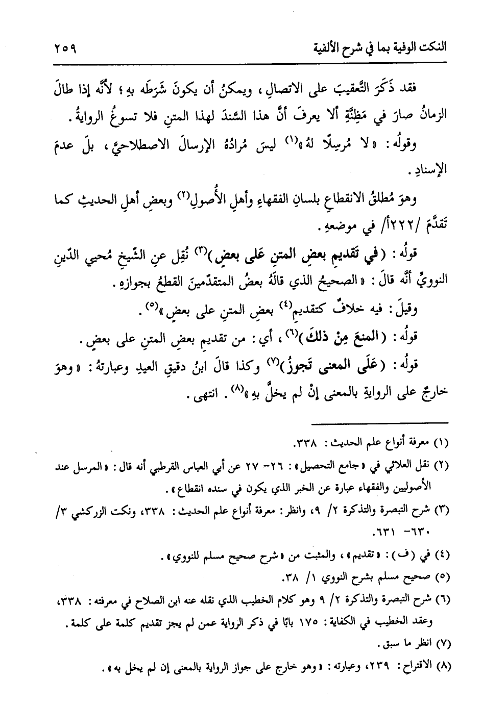(¬6) شرح التبصرة والتذكرة 2/ 9 وهو كلام الخطيب الذي نقله عنه ابن الصلاح في معرفته: 338، وعقد الخطيب في الكفاية: 175 باباً في ذكر الرواية عمن لم يجز تقديم كلمة على كلمة.