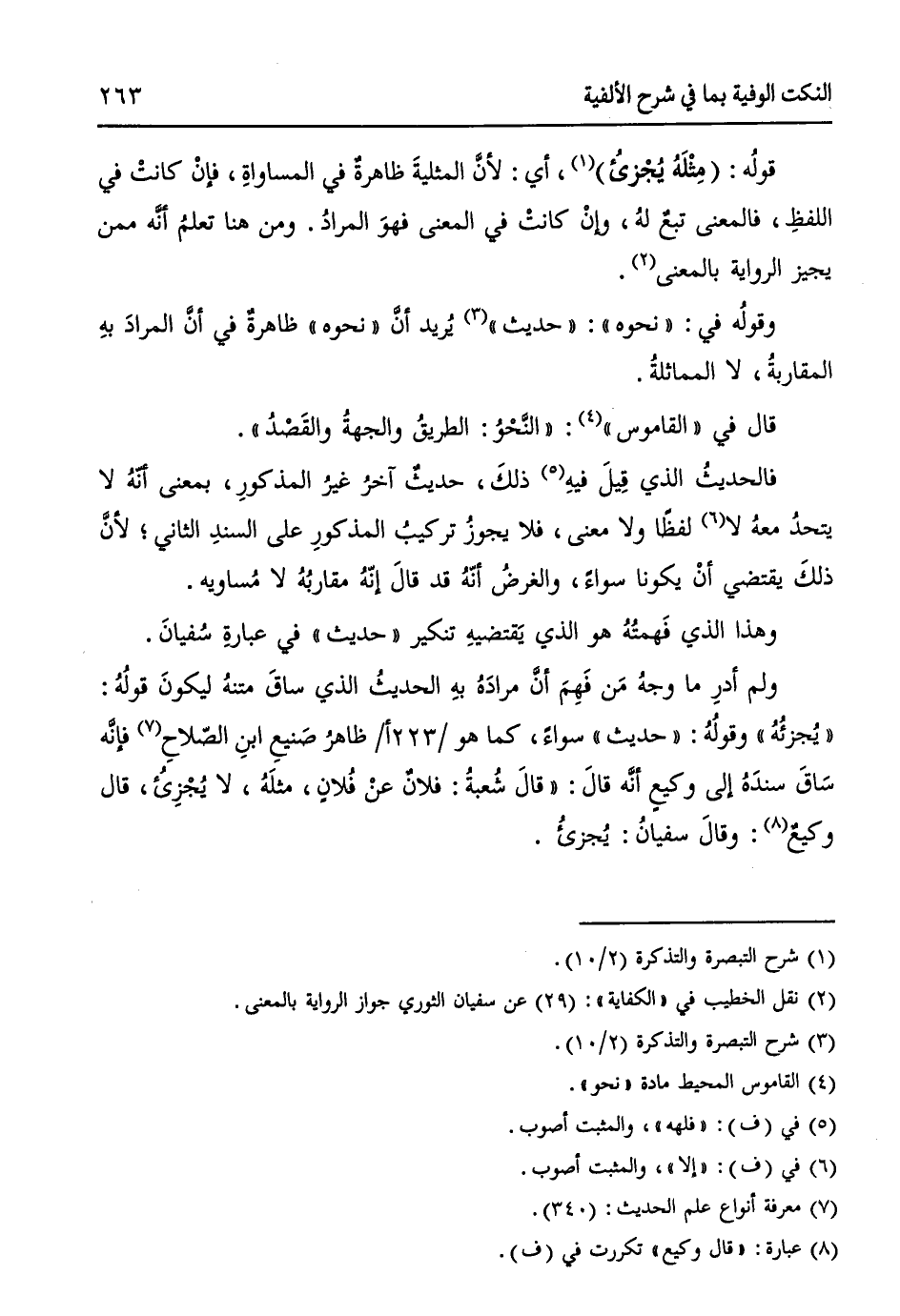 قولُهُ: (مِثْلَهُ يُجْزىءُ) (¬1)، أي: لأنَّ المثليةَ ظاهرةٌ في المساواةِ، فإنْ كانتْ في اللفظِ، فالمعنى تبعٌ لهُ. وإنْ كانتْ في المعنى فهوَ المرادُ. ومن هنا تعلمُ أنَّه ممن يجيز الرواية بالمعنى (¬2).
