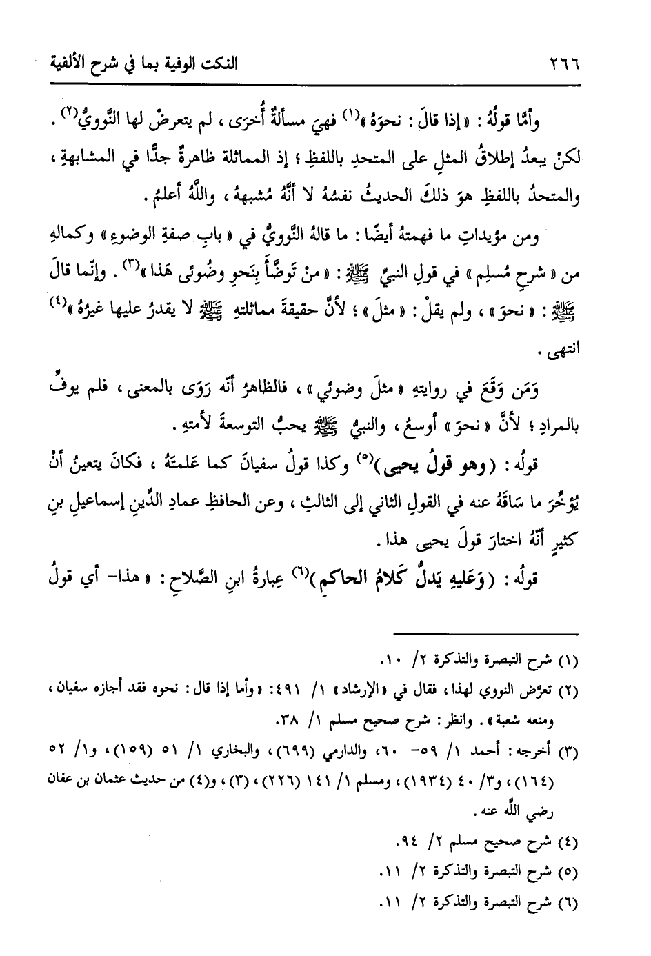 ومن مؤيداتِ ما فهمتهُ أيضاً، ما قالهُ النَّوويُّ في ((بابِ صفةِ الوضوءِ)) وكمالهِ من " شرحِ مُسلِم " في قولِ النبيِّ - صلى الله عليه وسلم -: ((منْ تَوضَّأَ بِنَحوِ وضُوئي هَذا)) (¬3). وإنّما قالَ - صلى الله عليه وسلم -: ((نحوَ))، ولم يقلْ: ((مثلَ))؛ لأنَّ حقيقةَ مماثلتهِ - صلى الله عليه وسلم - لا يقدرُ عليها غيرُهُ)) (¬4). انتهى.
