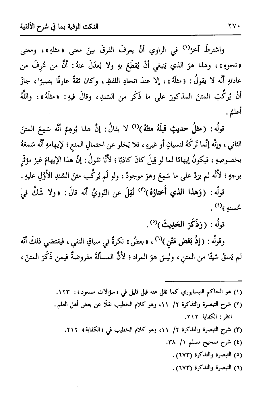 واشترطَ آخرُ (¬1) في الراوي أنْ يعرفَ الفرقَ بينَ معنى ((مثلهِ))، ومعنى ((نحوهِ))، وهذا هوَ الذي يَنبغي أنْ يُقطَعَ بهِ ولا يُعدَلَ عنهُ: أنَّ من عُرِفَ من عادتهِ أنَّه لا يقولُ: ((مثلَهُ))، إلاّ عندَ اتحادِ اللفظِ، وكان ثقةً عارفاً بصيراً، جازَ أنْ يُركِّبَ المتنَ المذكورَ، على ما ذَكَر من السّندِ، وقالَ فيهِ: ((مثلَهُ))، واللهُ أعلمُ.