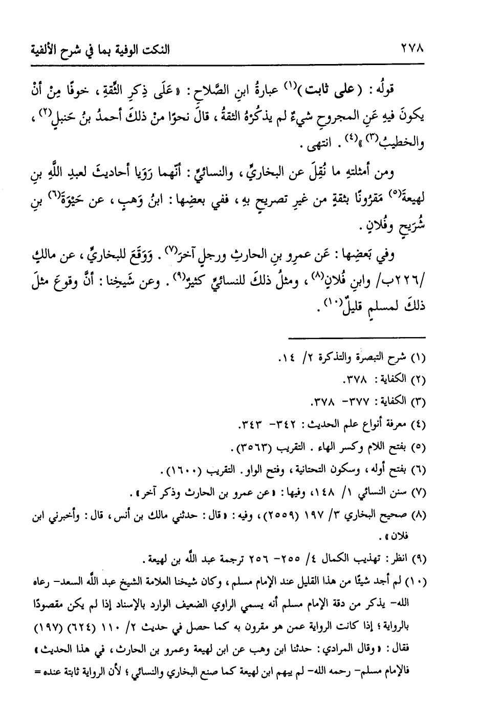 ومن أمثلتهِ ما نُقِلَ عن البخاريِّ، والنسائيِّ: أنّهما رَوَيا أحاديثَ لعبدِ اللهِ بنِ لهيعةَ (¬5) مَقرُوناً بثقةٍ من غيرِ تصريحٍ بهِ، ففي بعضِها: ابنُ وَهبٍ، عن حَيْوَةَ (¬6) بنِ شُرَيحٍ، وفُلانٍ.