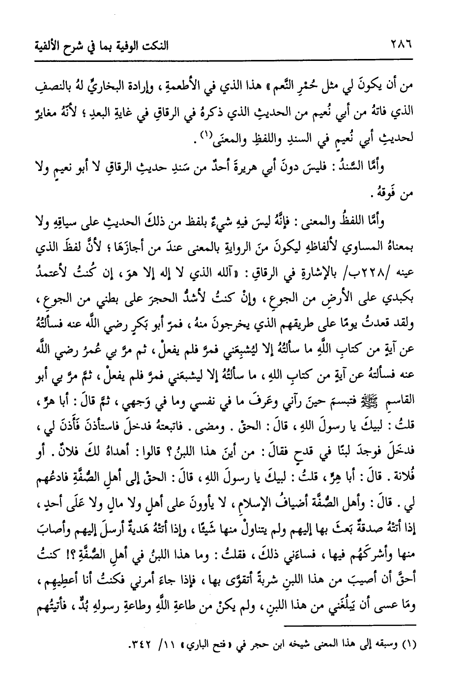 وأمَّا اللفظُ والمعنى: فإنَّهُ ليسَ فيهِ شيءٌ بلفظ من ذلكَ الحديثِ على سياقِهِ ولا بمعناهُ المساوي لألفاظهِ ليكونَ منَ الروايةِ بالمعنى عندَ من أجازَهَا؛ لأنَّ لفظَ الذي عينه /228ب/ بالإشارةِ في الرقاقِ: ((آللهُ الذي لا إله إلا هوَ، إن كُنتُ لأعتمدُ بكبدي على الأرضِ من الجوعِ، وإنْ كنتُ لأشدُّ الحجرَ على بطني من الجوعِ، ولقد قعدتُ يوماً على طريقهم الذي يخرجونَ منهُ، فمرّ أبو بَكرٍ - رضي الله عنه - فسألتُهُ عن آيةٍ من كتابِ اللهِ ما سألتُهُ إلا ليُشبِعَني فمرَّ فلم يفعلْ، ثم مرَّ بي عُمرُ - رضي الله عنه - فسألتهُ عن آيةٍ من كتابِ اللهِ، ما سألتُهُ إلا ليشبِعَني فمرَّ فلم يفعلْ، ثمَّ مرَّ بي أبو القاسمِ - صلى الله عليه وسلم - فتبسمَ حينَ رآني وعَرفَ ما في نفسي وما في وَجهي، ثمَّ قالَ: أبا هرٍّ، قلتُ: لبيكَ يا رسولَ اللهِ، قالَ: الحقْ، ومضى. فاتبعتهُ فدخلَ فاستأذنَ فَأَذِنَ لي، فدخَلَ فوجدَ لبناً في قدحٍ فقالَ: من أينَ هذا اللبنُ؟ قالوا: أهداهُ لكَ فلانٌ (أو فُلانة (قالَ: أبا هِرٍّ، قلتُ: لبيكَ يا رسولَ اللهِ، قالَ: الحقَ إلى أهلِ الصُّفَّةِ فادعُهم لي. قالَ: وأهل الصُّفَّة أضيافُ الإسلامِ، لا يأوونَ على أهلٍ ولا مالٍ ولا عَلَى أحدٍ، إذا أتتْهُ صدقةٌ بَعثَ بها إليهم ولم يتناولْ منها شَيئاً، وإذا أتتْهُ هَديةٌ أرسلَ إليهم وأصابَ منها وأشركَهُم فيها، فساءَني ذلكَ، فقلتُ: وما هذا اللبنُ في أهلِ الصُّفَّةِ؟ كنتُ أحقَّ أن أصيبَ من هذا اللبنِ شربةً أتقوَّى بها، فإذا جاءَ أمرني فكنتُ أنا أعطِيهِم، ومَا عسى أن يَبلُغَني من هذا اللبنِ، ولم يكنْ من طاعةِ اللهِ وطاعةِ رسولهِ بُدٌّ، فأتيتُهم