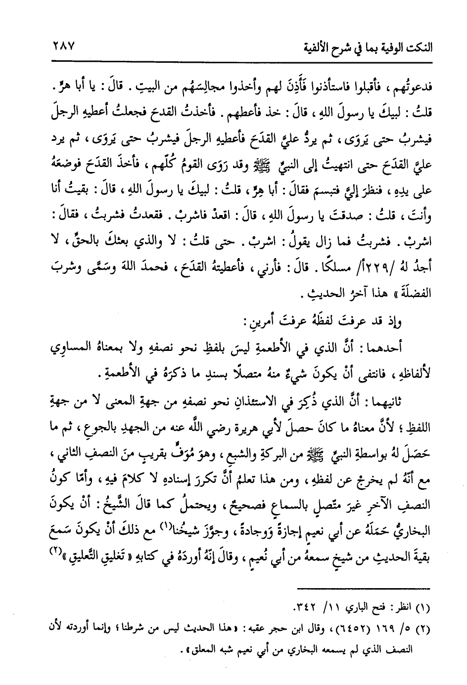 فدعوتُهم، فأقبلوا فاستأذنوا فَأَذِنَ لهم وأخذوا مجالِسَهُم من البيتِ. قالَ: يا أبا هرٍّ، قلتُ: لبيكَ يا رسولَ اللهِ، قالَ: خذ فاعطهم، فأخذتُ القدحَ فجعلتُ أعطيهِ الرجلَ فيشربُ حتى يَروَى، ثم يردُّ عليَّ القدَحَ فأعطيهِ الرجلَ فيشربُ حتى يَروَى، ثم يرد عليَّ القدَحَ حتى انتهيتُ إلى النبيِّ - صلى الله عليه وسلم - وقد رَوَى القومُ كُلّهم، فأخذَ القدَحَ فوضعَهُ على يدِهِ، فنظرَ إليَّ فتبسمَ فقالَ: أبا هِرٍّ، قلتُ: لبيكَ يا رسولَ اللهِ، قالَ: بقيتُ أنا وأنتَ، قلتُ: صدقتَ يا رسولَ اللهِ، قالَ: اقعدْ فاشربْ، فقعدتُ فشربتُ، فقالَ: اشربْ، فشربتُ فما زال يقولُ: اشربْ، حتى قلتُ: لا والذي بعثكَ بالحقِّ، لا أجدُ لهُ / 229 أ / مسلكاً. قالَ: فأرني، فأعطيتهُ القدَحَ، فحمدَ اللهَ وسَمَّى وشربَ الفضلَةَ)) هذا آخرُ الحديثِ.