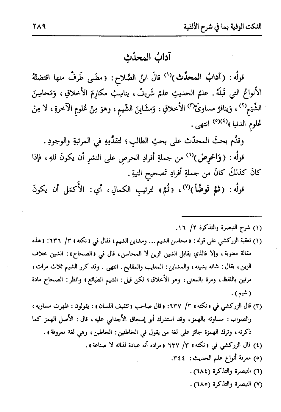 قوله: (آدابُ المحدِّثِ) (¬1) قالَ ابنُ الصَّلاحِ: ((مضَى طَرفٌ منها اقتضتْهُ الأنواعُ التي قَبلَهُ. علمُ الحديثِ علمٌ شَريفٌ، يناسِبُ مكارِمَ الأخلاقِ، وَمحَاسِنَ الشِّيَمِ (¬2)، وَينافرُ مساوىءَ (¬3) الأخلاقِ، وَمشَايِنَ الشّيمِ، وهوَ مِنْ عُلومِ الآخرةِ، لا مِنْ عُلومِ الدنيا)) (¬4). (¬5) انتهى.