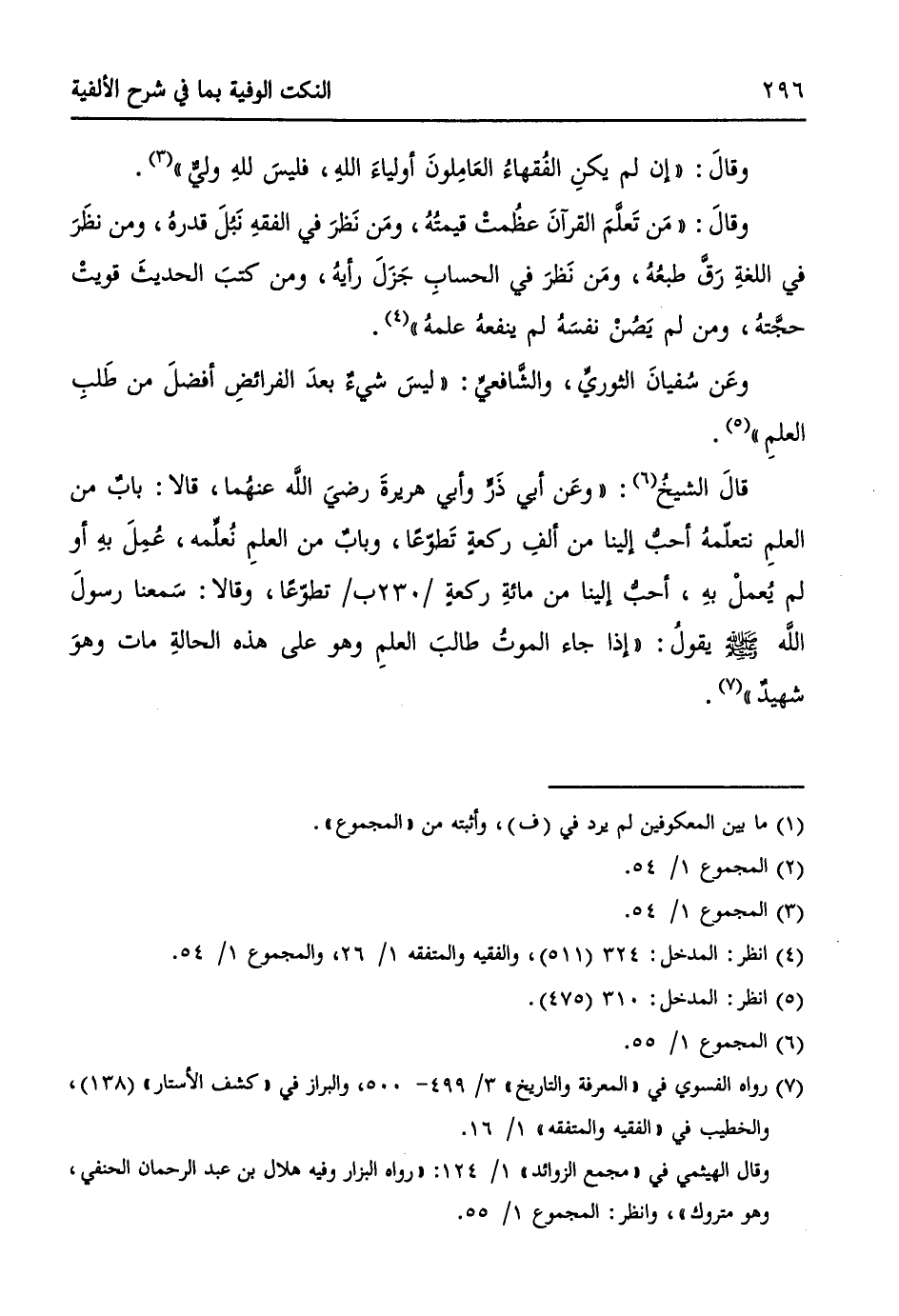 قالَ الشيخُ (¬4): ((وعَن أبي ذَرٍّ، وأبي هريرةَ رضيَ اللهُ عنهُما، قالا: بابٌ من العلمِ نتعلّمهُ أحبُ إلينا من ألفِ ركعةٍ تَطوّعاً، وبابٌ من العلمِ نُعلِّمه، عُمِلَ بهِ أو لم يُعملْ بهِ أحبُّ إلينا من مئةِ ركعةٍ /230 ب/ تطوّعاً، وقالا: سَمعنا رسولَ اللهِ - صلى الله عليه وسلم - يقولُ: ((إذا جاء الموتُ طالبَ العلمِ وهو على هذه الحالةِ مات وهوَ شهيدٌ)) (¬5).