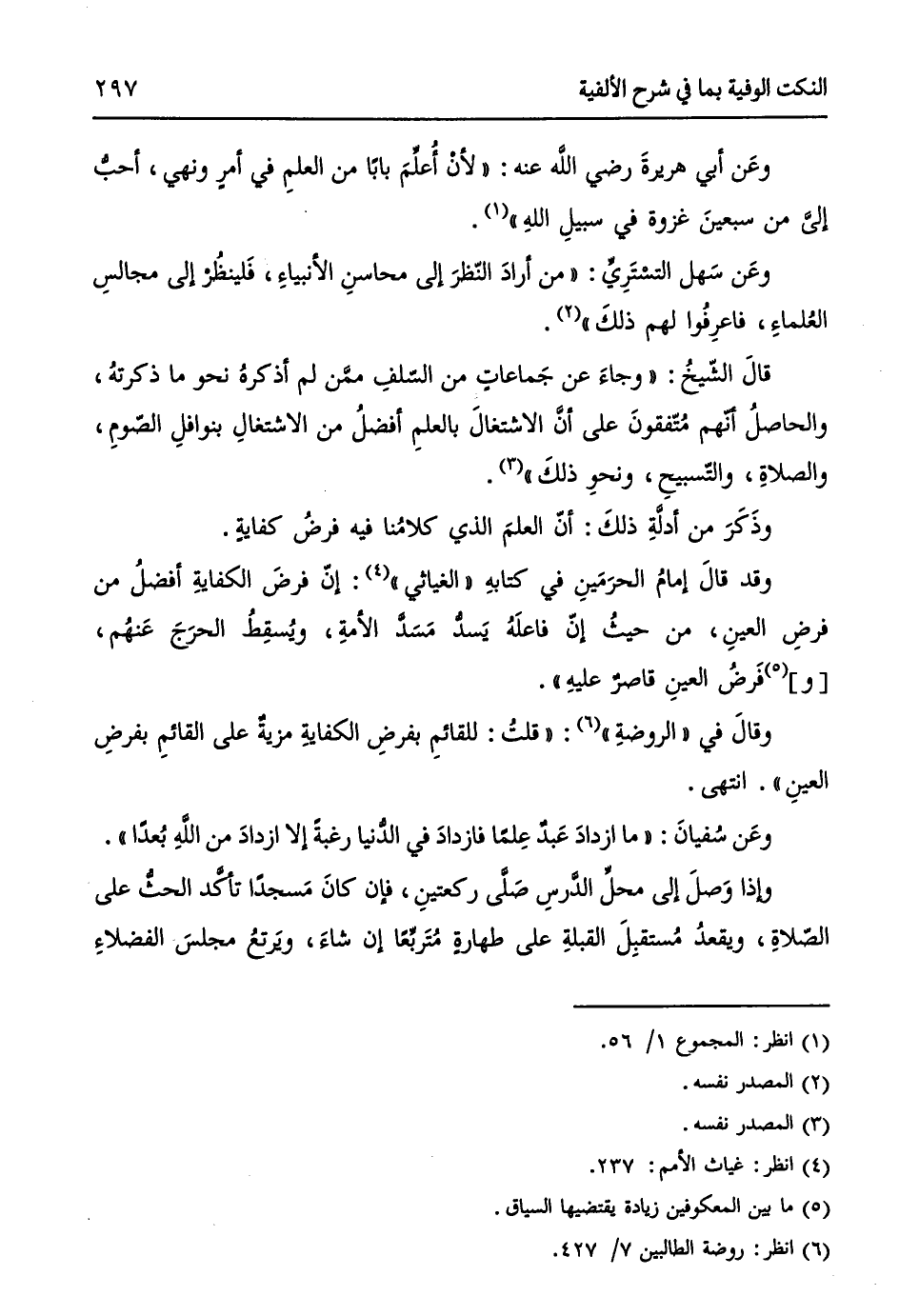 قالَ الشّيخُ: ((وجاءَ عن جَماعاتٍ من السّلفِ، ممَّن لم أذكرهُ نحو ما ذكرتهُ، والحاصلُ أنّهم مُتّفقونَ على أنَّ الاشتغالَ بالعلمِ أفضلُ من الاشتغالِ بنوافلِ الصّومِ، والصلاةِ، والتّسبيحِ، ونحوِ ذلكَ)) (¬3).