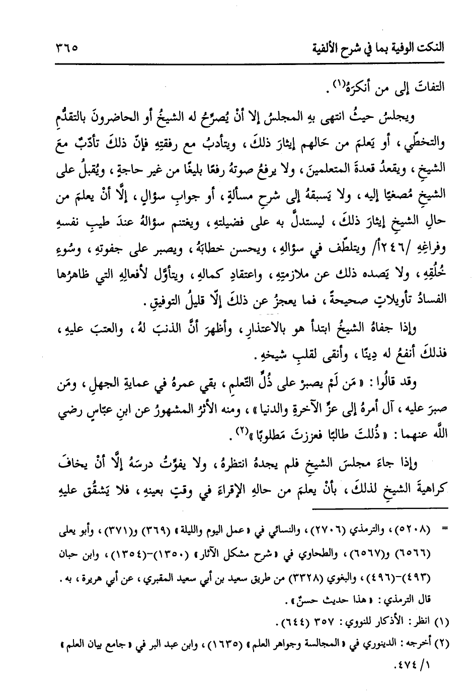 ويجلسُ حيثُ انتهى بهِ المجلسُ إلا أنْ يُصرِّحُ له الشيخُ، أو الحاضرونَ بالتقدُّمِ والتخطّي، أو يَعلمَ من حَالهم إيثارَ ذلكَ، ويتأدبُ مع رفقتِهِ فإنّ ذلكَ تأدّبٌ معَ الشيخِ، ويقعدُ قعدةَ المتعلمينَ، ولا يرفعُ صوتهُ رفعاً بليغاً من غير حاجةٍ، ويُقبلُ على الشيخِ مُصغياً إليهِ، ولا يَسبقهُ إلى شرحِ مسألةٍ، أو جوابِ سؤالٍ، إلاَّ أنْ يعلمَ من حالِ الشيخِ إيثارَ ذلكَ، ليستدلَّ به على فضيلتهِ، ويغتنمَ سؤالهُ عندَ طيبِ نفسهِ وفراغِهِ / 246 أ / ويتلطّفَ في سؤالهِ، ويحسنَ خطابَهُ، ويصبرَ على جفوتهِ، وسُوءِ خُلُقِهِ، ولا يَصده ذلك عن ملازمتِهِ، واعتقادِ كمالهِ، ويتأوَّل لأفعالِهِ التي ظاهرُها الفسادُ تأويلاتٍ صحيحةً، فما يعجزُ عن ذلكَ إلاّ قليلُ التوفيقِ.