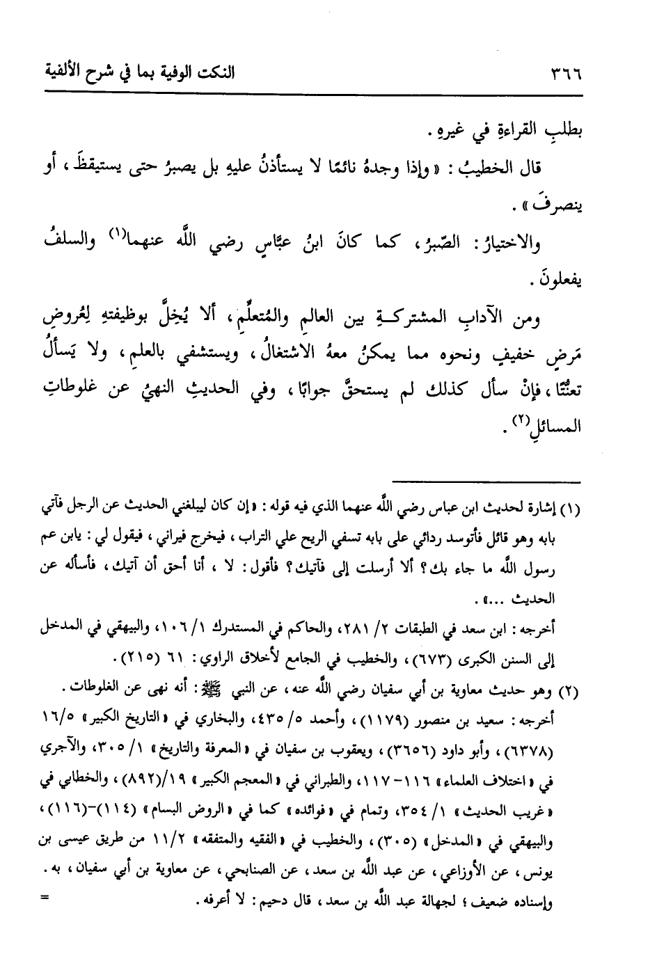 (¬1) إشارة لحديث ابن عباس رضي الله عنهما الذي فيه قوله: ((كان ليبلغني الحديث عن الرجل فآتي بابه وهو قائل فأتوسد ردائي على بابه تسفي الريحُ عليَّ الترابَ، فيخرج فيراني، فيقول لي: يا ابن عم رسول الله ما جاء بك؟ ألا أرسلت إلي فآتيك؟ فأقول: لا أنا أحق أن آتيك، فأسأله عن الحديث ... )).