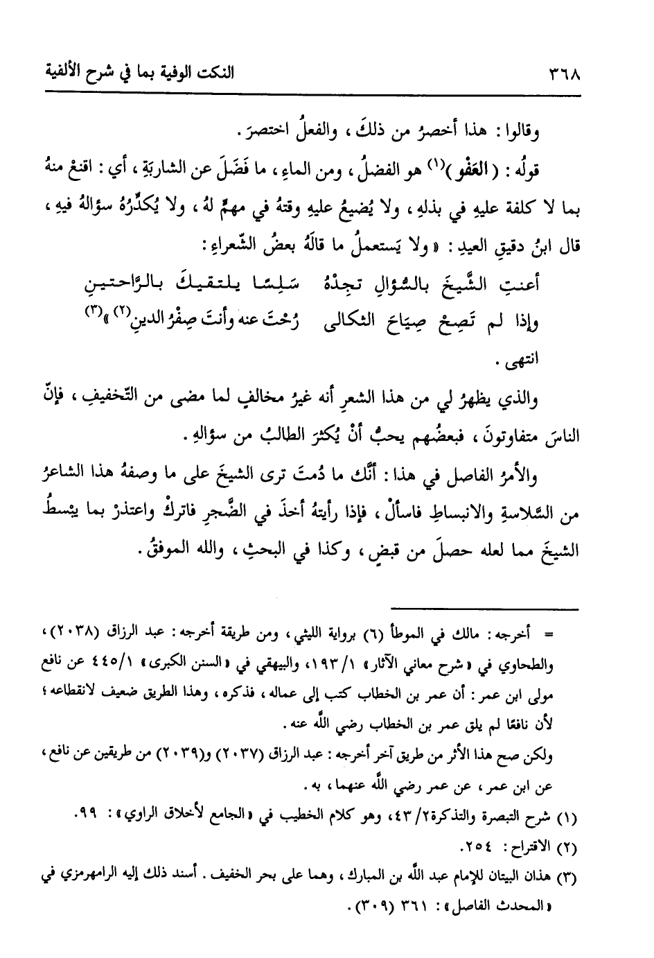 قولهُ: (العَفْو) (¬1) هو الفضلُ، ومن الماءِ: ما فَضَلَ عن الشاربَةِ، أي: أقنعَ منهُ بما لا كلفة عليهِ في بذلهِ، ولا يُضيعُ عليهِ وقتهُ في مهمٍ لهُ، ولا يُكدِّرُهُ سُؤالهُ فيهِ، قال ابنُ دقيقِ العيدِ: ((ولا يَستعملُ ما قالَهُ بعضُ الشّعراءِ