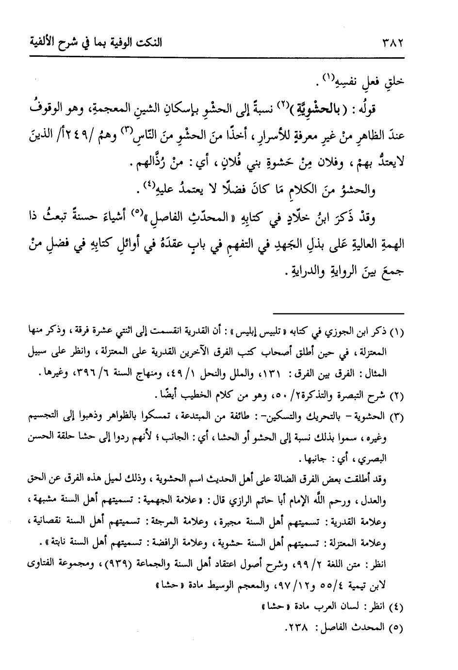 قولُهُ: (بالحشْوِيَّةِ) (¬2) نسبةً إلى الحشْوِ بإسكانِ الشينِ المعجمةِ، وهو الوقوفُ عندَ الظاهرِ منْ غيرِ معرفةٍ للأسرارِ، أخذاً منَ الحشْوِ منَ النّاسِ (¬3) وهمُ