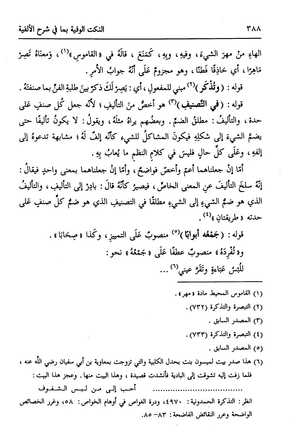 قوله: (في التَّصْنيفِ) (¬3) هو أخصُّ منَ التأليفِ؛ لأنّه جعل كُل صنفٍ عَلى حدة، والتأليفُ: مطلقُ الضمِّ. وبعضُهم يراهُ مثلَهُ، ويقولُ: لا يكونُ تأليفاً حتى يضمَّ الشيءَ إلى شكلِهِ فيكونَ المشاكلُ للشئ كأنّه إلفٌ لَهُ؛ مشابهتهُ تدعوهُ إلى إلفهِ، وعَلَى كلِّ حالٍ فليسَ في كلامِ النظمِ ما يُعابُ بِهِ.