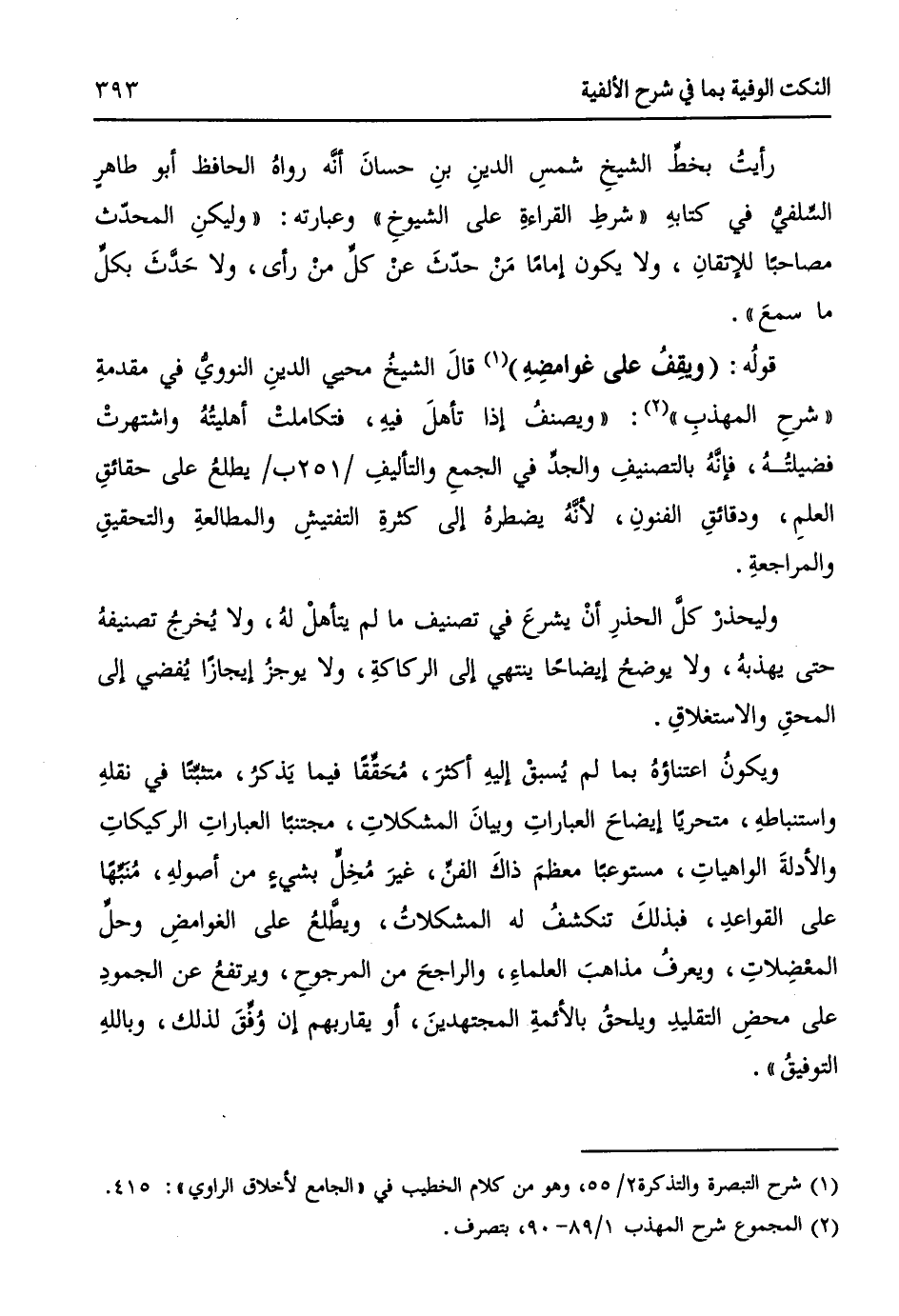 ويكونُ اعتناؤهُ بما لم يُسبقْ إليهِ أكثرَ، مُحَقِّقاً فيما يَذكرُ، متثبِّتاً في نقلهِ واستنباطهِ، متحرياً إيضاحَ العباراتِ وبيانَ المشكلاتِ، مجتنباً العباراتِ الركيكاتِ والأدلةَ الواهياتِ، مستوعباً معظمَ ذاكَ الفنِّ، غيرَ مُخِلٍّ بشيءٍ من أصولهِ، مُنَبِّهاً على القواعدِ، فبذلكَ تنكشفُ له المشكلاتُ، ويطَّلعُ على الغوامضِ وحلِّ المعْضِلاتِ، ويعرفُ مذاهبَ العلماءِ، والراجحَ من المرجوحِ، ويرتفعُ عن الجمودِ على محضِ التقليدِ ويلحقُ بالأئمةِ المجتهدينَ، أو يقاربهم إن وُفِّقَ لذلك، وباللهِ