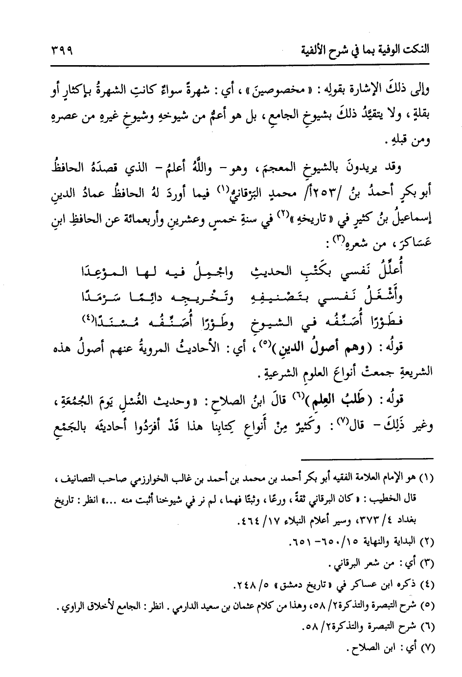 وقد يريدونَ بالشيوخِ المعجمَ، وهو - والله أعلمُ - الذي قصدَهُ الحافظُ أبو بكرٍ أحمدُ بنُ / 253 أ / محمدٍ البَرْقانيُّ (¬1) في ما أوردَ لهُ الحافظُ عمادُ الدينِ إسماعيلُ ابنُ كثيرٍ في " تاريخهِ " (¬2) في سنةِ خمسٍ وعشرينَ وأربعمئة عن الحافظِ ابنِ عَسَاكرَ، من شعرهِ (¬3):