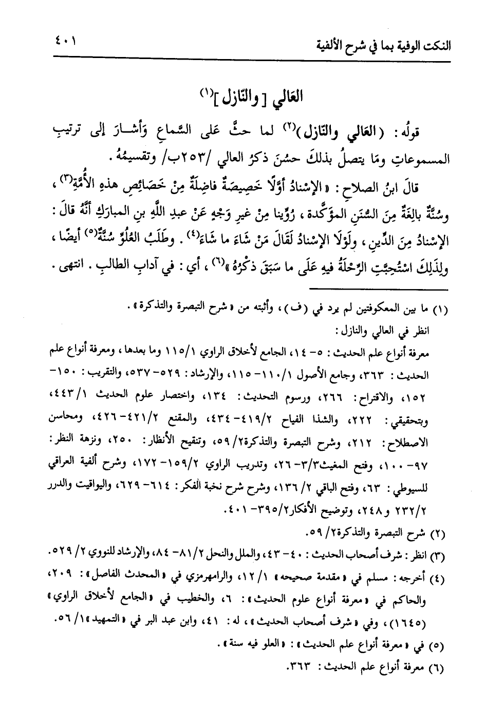 قولُهُ: (العَالي والنّازل) (¬2) لما حثَّ عَلى السَّماعِ وَأشارَ إلى ترتيبِ المسموعاتِ ومَا يتصلُ بذلكَ حسُنَ ذكرُ العالي / 253 ب / وتقسيمُهُ.
