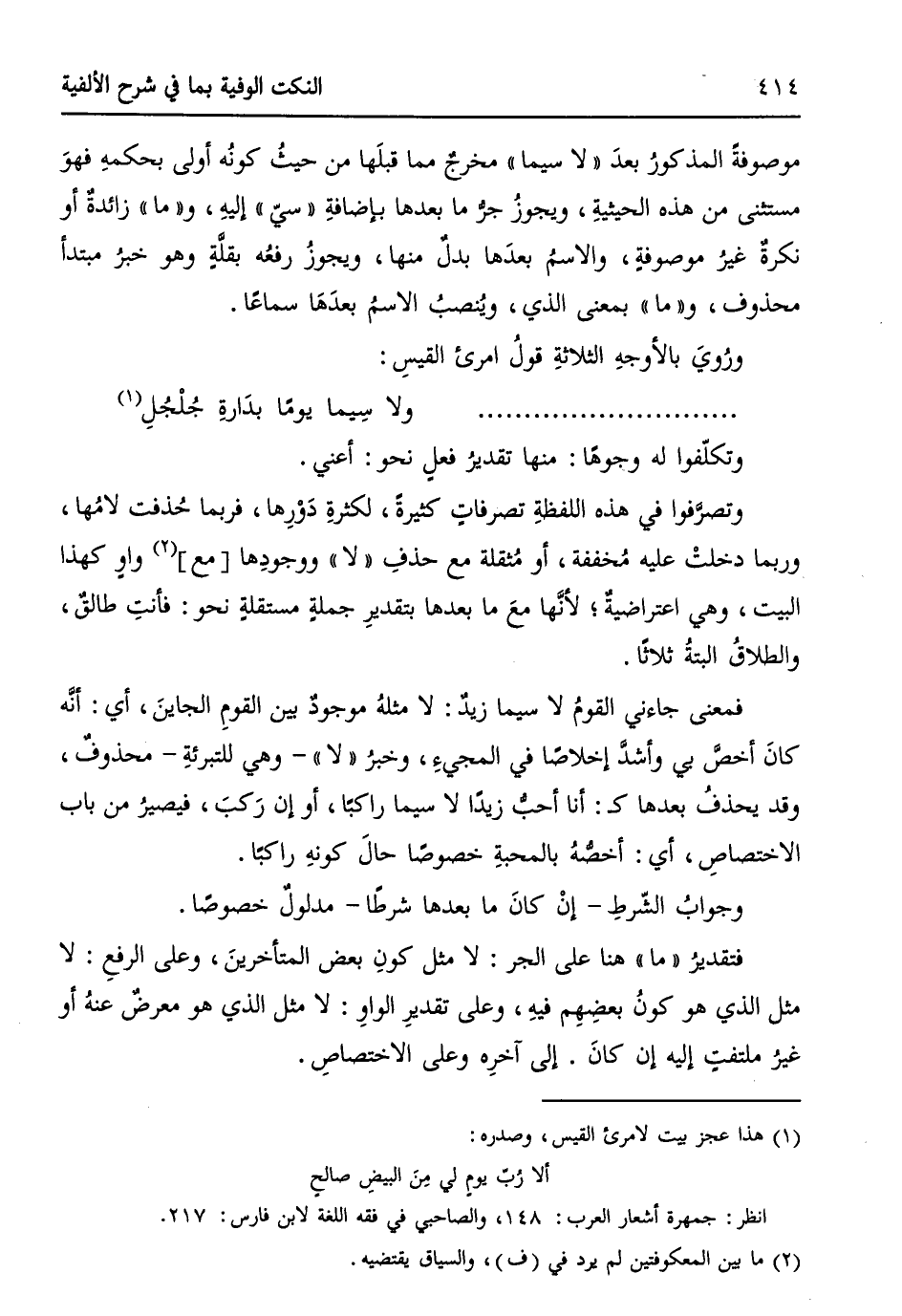 موصوفةَ المذكورِ بعدَ ((لا سيما)) مخرجٌ مما قبلَها من حيثُ كونُه أولى بحكمهِ فهوَ مستثنى من هذه الحيثيةِ، ويجوزُ جرُّ ما بعدها بإضافةِ ((سيّ)) إليهِ، و ((ما)) زائدةٌ أو نكرةٌ غيرُ موصوفةٍ، والاسمُ بعدَها بدلٌ منها، ويجوزُ رفعُه بقلَّةٍ وهو خبرُ مبتدأ محذوف، و ((ما)) بمعنى الذي، ويُنصبُ الاسمُ بعدَهَا سماعَاً.
