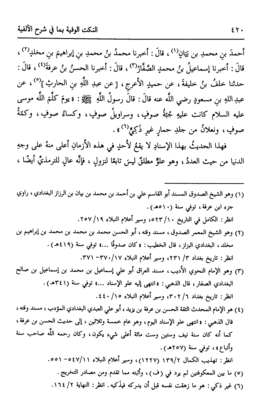 أحمدَ بنِ محمدِ بن بَيَانٍ (¬1)، قالَ: أخبرنا محمدُ بنُ محمدِ بنِ إبراهيمَ بنِ مخلدٍ (¬2)، قالَ: أخبرنا إسماعيلُ بنُ محمدٍ الصَّفَّارُ (¬3)، قالَ: أخبرنا الحسنُ بنُ عرفةَ (¬4)، قالَ: حدثنا خلفُ بنُ خليفةَ، عن حميدٍ الأعرجِ، [عن عبدِ اللهِ بنِ الحارثِ] (¬5)، عن عبدِ اللهِ بنِ مسعودٍ - رضي الله عنه - قالَ: قالَ رسولُ اللهِ - صلى الله عليه وسلم -: ((يومَ كلَّمَ اللهُ موسى - عليه السلام - كانت عليهِ جُبّةُ صوفٍ، وسراويلُ صوفٍ، وكساءُ صوفٍ، وكمّةُ صوفٍ، ونعلاهُ من جلدِ حمارٍ غيرِ ذَكِيٍّ (¬6))).