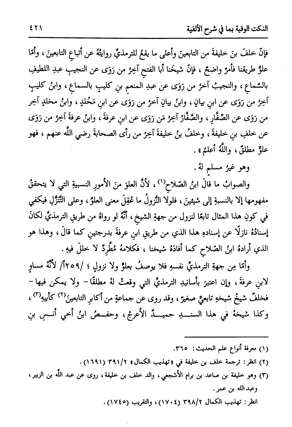 وأمّا مِن جهةِ الترمذيِّ نفسهِ فلا يوصفُ بعلوٍّ ولا نزولٍ / 259 أ / لأنَّهُ مساوٍ لابنِ عرفةَ، وإن اعتبرَ بأسانيدِ الترمذيِّ التي وقعتْ لهُ مطلقاً - ولا يمكن فيها - فخلفٌ شيخُ شيخهِ تابعيٌّ صغيرٌ، وقد روى عن جماعةٍ من أكابرِ التابعينَ (¬2) كأبيهِ (¬3)، وكذا شيخهُ في هذا السندِ حميدٌ الأعرجُ، وحفصُ بنُ أخي أنسِ بنِ