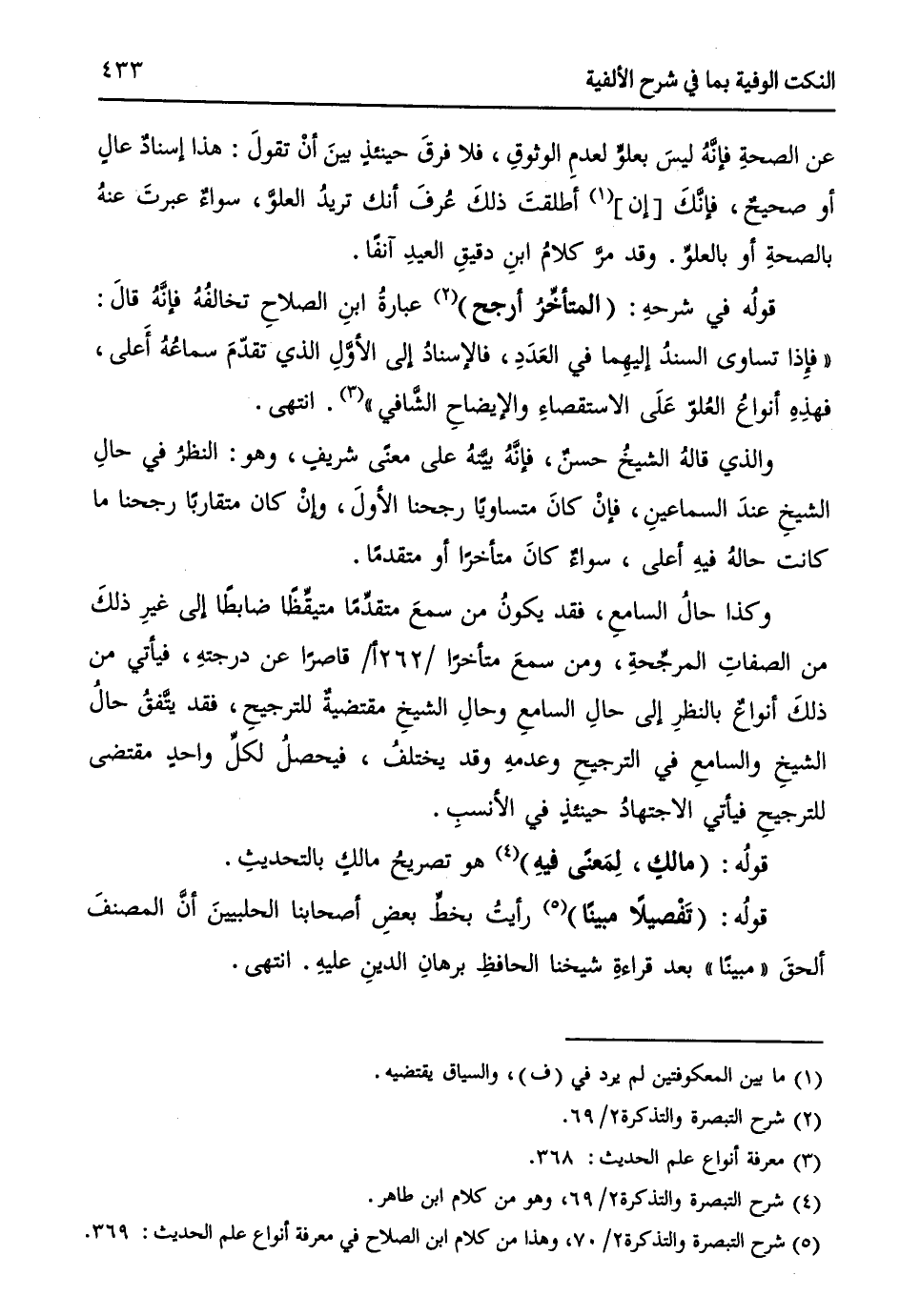 قولُهُ في شرحهِ: (المتأخِّرُ أرجحَ) (¬2) عبارةُ ابنِ الصلاحِ تخالفُهُ فإنَّه قالَ: ((فإِذا تساوى السندُ إليهِما في العَدَدِ، فالإسنادُ إلى الأوَّلِ الذي تقدّمَ سماعُهُ أَعلى، فهذِهِ أنواعُ العُلوِّ عَلَى الاستقصاءِ والإِيضاحِ الشَافي)) (¬3). انتهى.