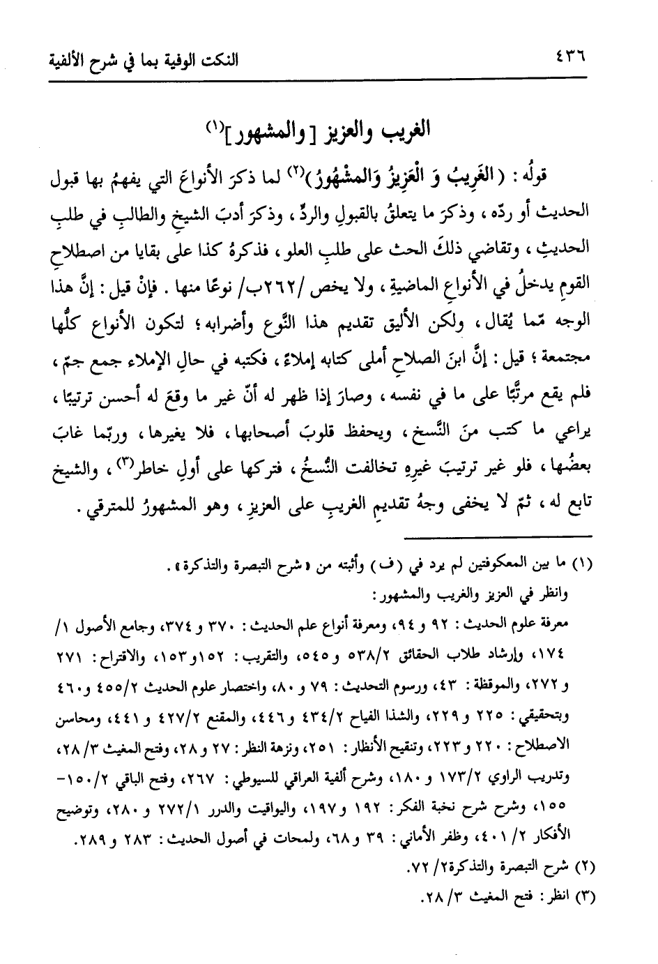 قولُهُ: (الغَرِيْبُ وَالْعَزِيْزُ وَالمشْهُوْرُ) (¬2) لما ذكرَ الأنواعَ التي يفهمُ قبول الحديث أو ردّه، وذكرَ ما يتعلقُ بالقبولِ والردِ، وذكرَ أدبَ الشيخِ والطالبِ في طلبِ الحديثِ، وتقاضي ذلكَ الحث على طلبِ العلو، فذكرهُ كذا على بقايا من اصطلاحِ القومِ يدخلُ في الأنواعِ الماضيةِ، ولا يخص / 262 ب / نوعاً منها، فإنْ قيل: إنَّ هذا الوجه ممّا يُقال، ولكن الأليق: تقديم هذا النَّوع وأضرابه؛ لتكون الأنواع كلُّها مجتمعة؛ قيل: إنَّ ابنَ الصلاحِ أملى كتابه إملاءً، فكتبه في حالِ الإملاء جمع جمّ، فلم يقع مرتَّباً على ما في نفسه، وصارَ إذا ظهر له أنّ غير ما وقعَ له أحسن ترتيباً، يراعي ما كتب منَ النَّسخ، ويحفظ قلوبَ أصحابها، فلا يغيرها، وربّما غابَ بعضُها، فلو غير ترتيبَ غيرِهِ تخالفت النُّسخُ، فتركها على أولِ خاطر (¬3)، والشيخ تابع له، ثمّ لا يخفى وجهُ تقديمِ الغريبِ على العزيزِ، وهو المشهورُ للمترقي.