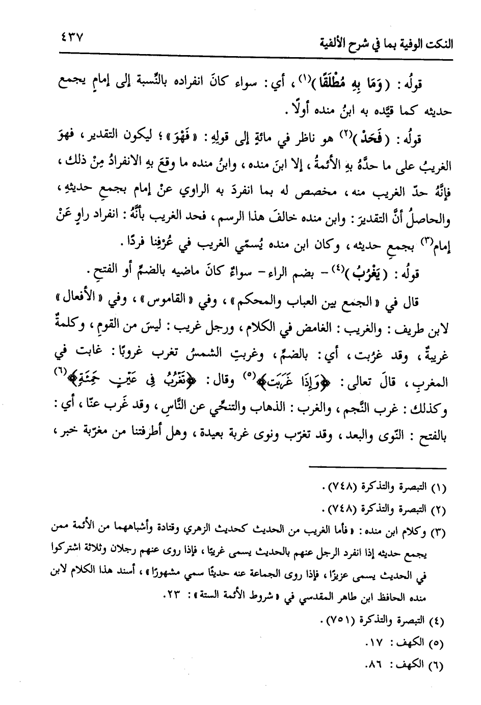 (¬3) وكلام ابن منده: ((فأما الغريب من الحديث كحديث الزهري وقتادة وأشباههما من الأئمة ممن يجمع حديثه إذا انفرد الرجل عنهم بالحديث يسمى غريباً، فإذا روى عنهم رجلان وثلاثة اشتركوا في الحديث يسمى عزيزاً، فإذا روى الجماعة عنه حديثاً سمي مشهوراً))، أسند هذا الكلام لابن منده الحافظ ابن طاهر المقدسي في " شروط الأئمة الستة ": 23.