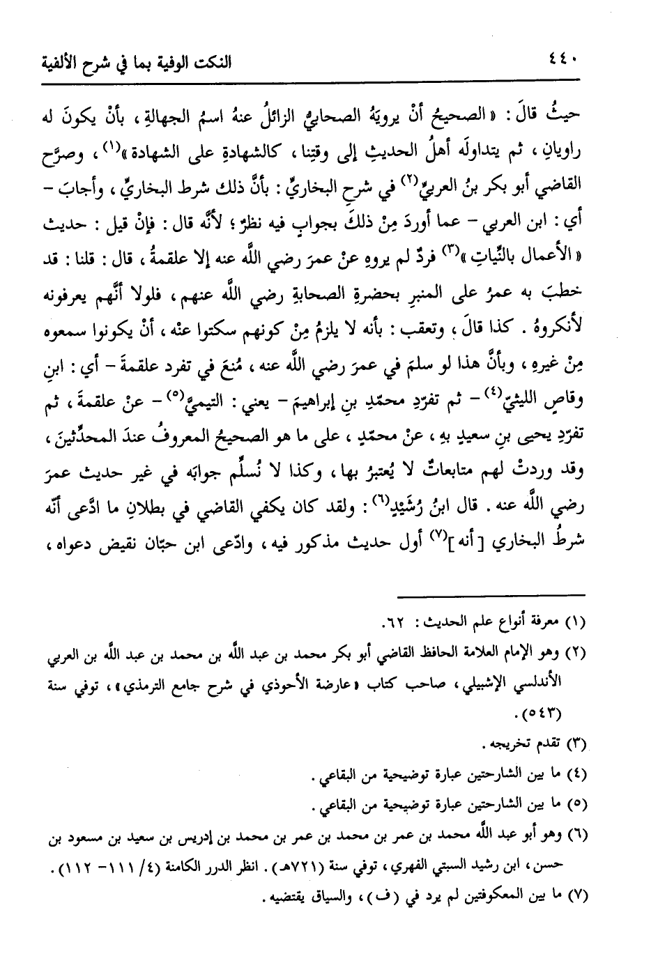 حيثُ قالَ: ((الصحيحُ أنْ يرويَهُ الصحابيُّ الزائلُ عنهُ اسمُ الجهالةِ، بأنْ يكونَ له راويانِ، ثمّ يتداولَه أهلُ الحديثِ إلى وقتِنا، كالشهادةِ على الشهادة)) (¬1)، وصرَّح القاضي أبو بكر بنُ العربيِّ (¬2) في شرحِ البخاريِّ: بأنَّ ذلك شرط البخاريِّ، وأجابَ - أي: ابن العربي - عما أوردَ مِنْ ذلكَ بجوابٍ فيه نظرٌ؛ لأنَّه قال: فإنْ قيل حديث ((الأعمال بالنِّياتِ)) (¬3) فردٌ لم يروهِ عنْ عمرَ - رضي الله عنه - إلا علقمةُ، قال: قلنا: قد خطبَ به عمرُ على المنبرِ بحضرةِ الصحابةِ - رضي الله عنهم -، فلولا أنَّهم يعرفونه لأنكروهُ كذا قالَ، وتعقب: بأنّه لا يلزمُ مِنْ كونهم سكتوا عنْه، أنْ يكونوا سمعوه مِنْ غيرهِ، وبأنَّ هذا لو سلمَ في عمرَ - رضي الله عنه -، مُنعَ في تفرد علقمةَ - أي: ابنِ وقاصٍ الليثيّ (¬4) - ثمّ تفرّدَ محمّدُ بنُ إبراهيمَ - يعني: التيميَّ (¬5) - عنْ علقمةَ، ثمّ تفرّدَ يحيى بنُ سعيدٍ به، عنْ محمّدٍ على ما هو الصحيحُ المعروفُ عندَ المحدِّثينَ، وقد وردتْ لهم متابعاتٌ لا يُعتبرُ بها، وكذا لا نُسلِّم جوابَه في غير حديث عمرَ - رضي الله عنه -. قال ابنُ رُشَيْدٍ (¬6): ولقد كان يكفي القاضي في بطلانِ ما ادَّعى أنّه شرطُ البخاري [أنه] (¬7) أول حديث مذكور فيه، وادّعى ابن حبّان نقيض دعواه، فقال: إنَّ