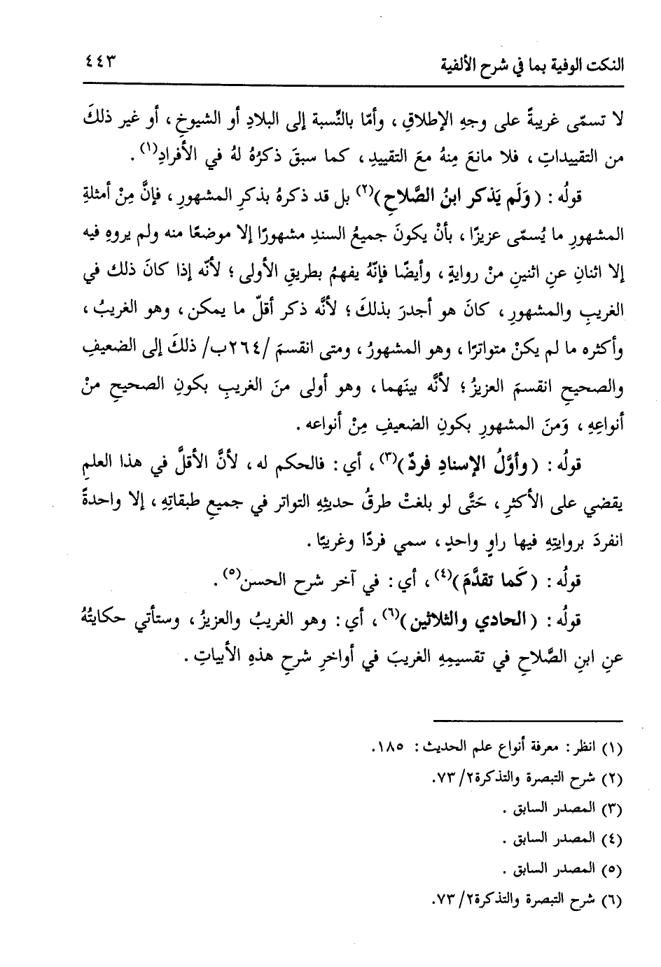 قولُهُ: (الحادي والثلاثين) (¬6)، أي: وهو الغريبُ والعزيزُ، وستأتي حكايتُهُ عنِ ابنِ الصَّلاحِ في تقسيمِهِ الغريبَ في أواخرِ شرحِ هذهِ الأبياتِ.