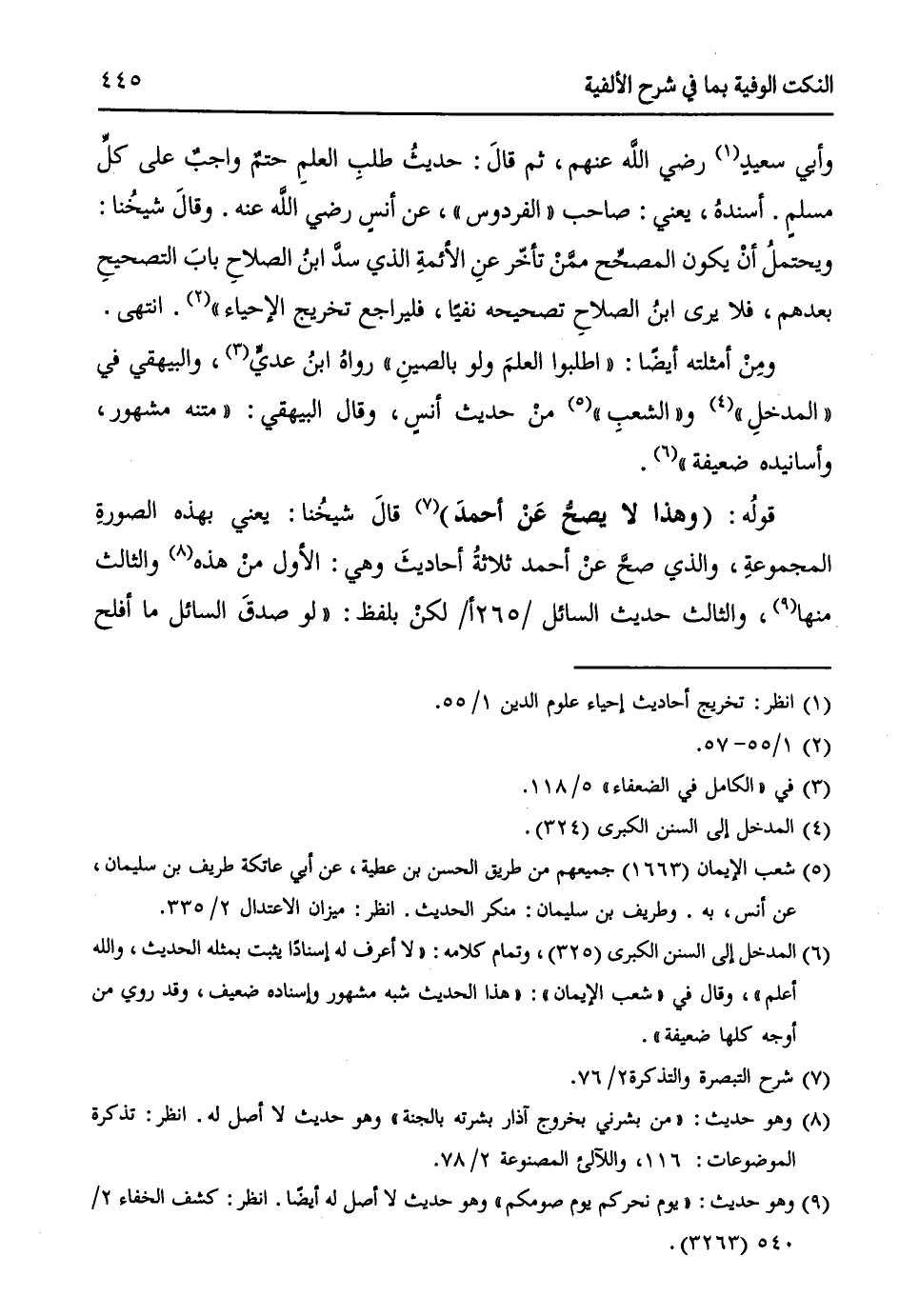 وأبي سعيدٍ (¬1) - رضي الله عنهم -، ثمّ قالَ: حديثُ طلبِ العلمِ حتمٌ واجبٌ على كلِ مسلمٍ، أسندهُ، يعني: صاحب " الفردوس "، عن أنسٍ - رضي الله عنه -، وقالَ شيخُنا: ويحتملُ أنْ يكون المصحِّح ممَّنْ تأخّر عصرهُ عنِ الأئمةِ الذين سدَّ ابنُ الصلاحِ بابَ التصحيحِ بعدهم، فلا يرى ابنُ الصلاحِ تصحيحه نفياً، فليراجع تخريج الإحياء)) (¬2). انتهى.