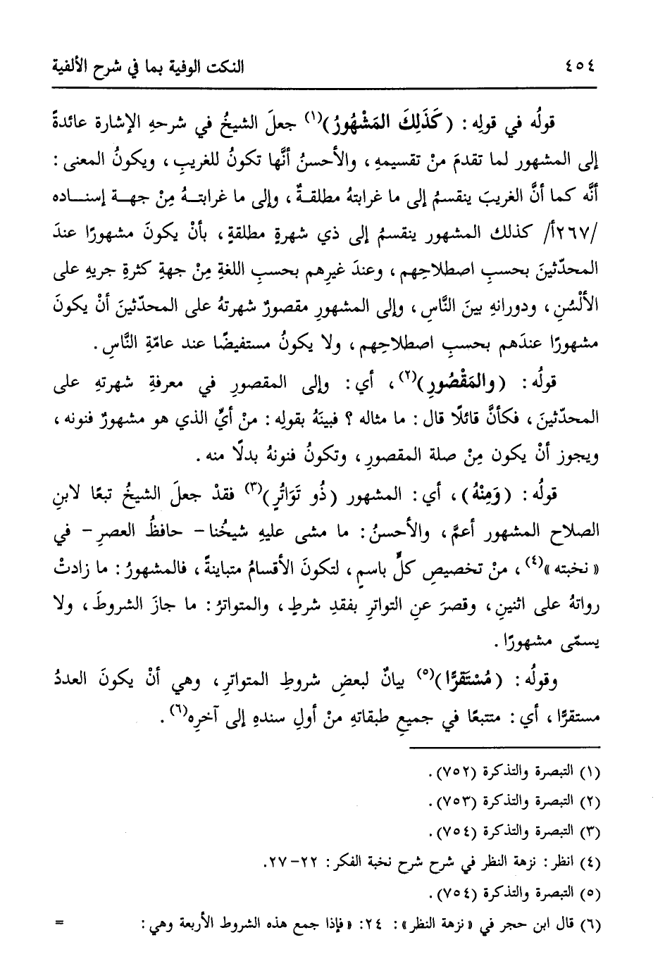 قولُهُ في قولهِ: (كَذَلِكَ الْمَشْهُوْرُ) (¬1) جعلَ الشيءَ في شرحهِ الإشارة عائدةً إلى المشهور لما تقدمَ منْ تقسيمهِ، والأحسنُ أنَّها تكونُ للغريبِ، ويكونُ المعنى: أنّه كما إنَّ الغريبَ ينقسمُ إلى ما غرابتهُ مطلقةً، وإلى ما غرابتهُ مِنْ جِهة إسناده / 267 أ /، كذلك المشهور ينقسمُ إلى ذي شهرةٍ مطلقةٍ، بأنْ يكونَ مشهوراً عندَ المحدّثينَ بحسبِ اصطلاحِهم، وعندَ غيرِهم بحسبِ اللغةِ مِنْ جهةِ كثرةِ جريهِ على الألْسُنِ، ودورانهِ بينَ النَّاسِ، وإلى المشهورِ مقصورٌ شهرتهُ على المحدّثينَ أنْ يكونَ مشهوراً عندَهم بحسبِ اصطلاحِهم، ولا يكونُ مستفيضاً عند عامّةِ النَّاسِ.