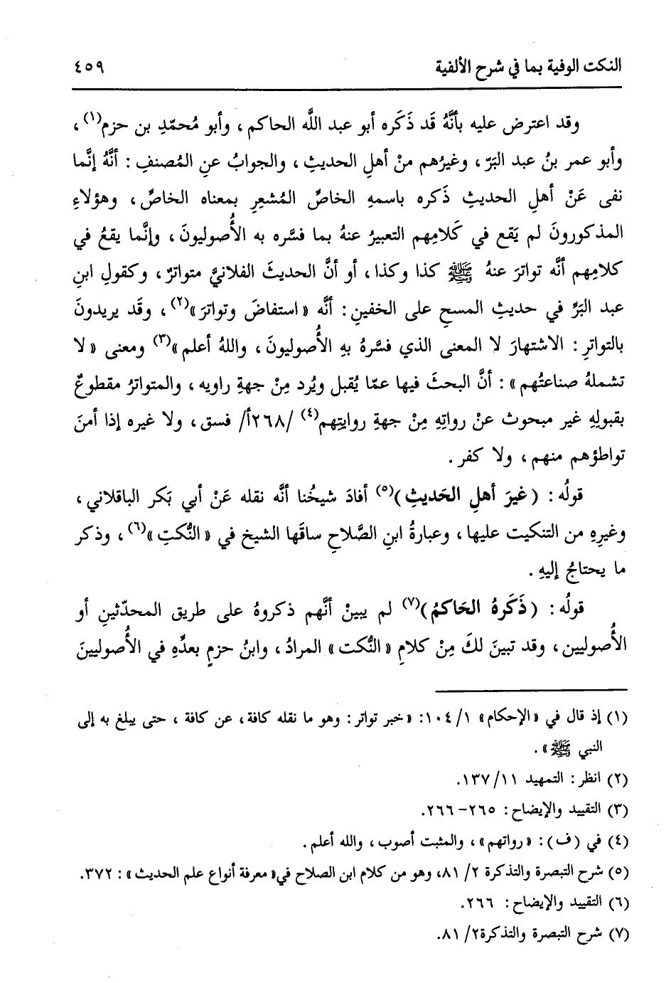 قولُهُ: (غيرَ أَهلِ الحَديثِ) (¬5) أفادَ شيخُنا أنَّه نقله عَنْ أبي بَكر الباقلاني، وغيرِهِ من التنكيت عليها، وعبارةُ ابنِ الصَّلاحِ ساقَها الشيخُ في " النُّكتِ " (¬6)، وذكر ما يحتاجُ إليهِ.