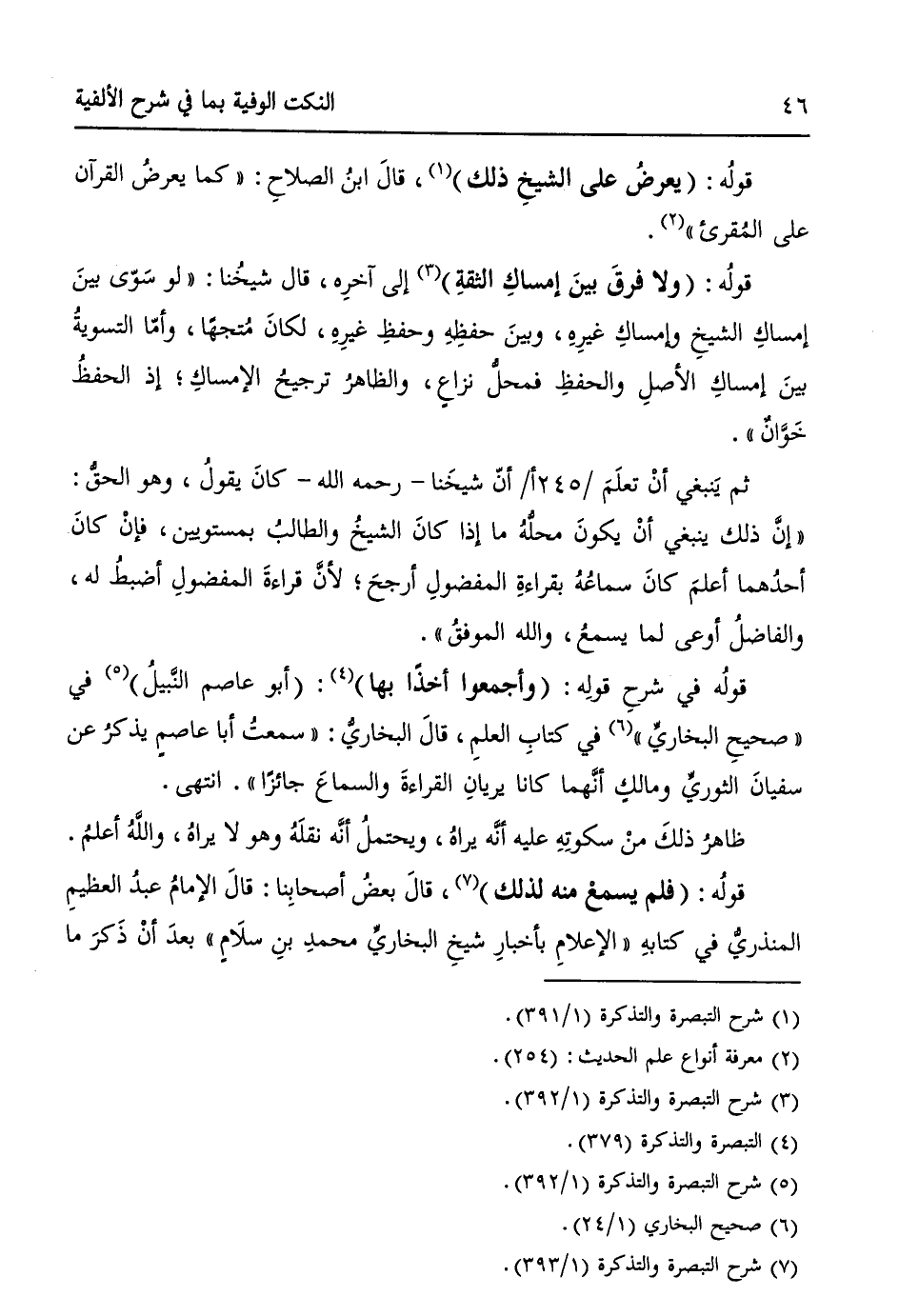 قولهُ في شرحِ قولهِ: (وأجمعوا أخذاً بها) (¬4): (أبو عاصم النَّبيلُ) (¬5) في " صحيحِ البخاريِّ " (¬6) في كتابِ العلمِ، قالَ البخاريُّ: ((سمعتُ أبا عاصمٍ يذكرُ عن سفيانَ الثوريِّ ومالكٍ أنَّهما كانا يريانِ القراءةَ والسماعَ جائزاً)). انتهى.