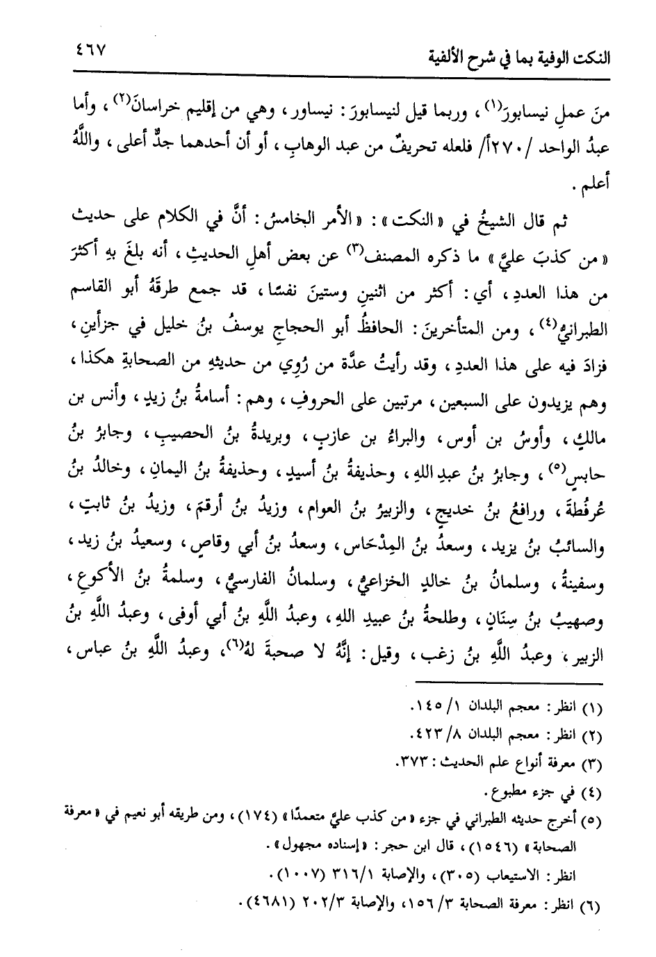 ثم قال الشيخُ في " النكت ": ((الأمر الخامسُ: إنَّ في الكلام على حديث ((من كذبَ عليَّ)) ما ذكره المصنف (¬3) عن بعض أهلِ الحديثِ، أنه بلغَ بهِ أكثرَ من هذا العددِ، أي: أكثر من اثنينِ وستينَ نفساً، قد جمع طرقَهُ أبو القاسم الطبرانيُّ (¬4)، ومن المتأخرينَ: الحافظُ أبو الحجاجِ يوسفُ بنُ خليل في جزأينِ، فزادَ فيه على هذا العددِ، وقد رأيتُ عدَّة من روى من حديثهِ من الصحابةِ هكذا، وهم يزيدونَ على السبعين، مرتبين على الحروفِ، وهم: أسامةُ بنُ زيدٍ، وأنس بن مالكٍ، وأوسُ ابن أوس، والبراءُ بن عازبٍ، وبريدةُ بنُ الحصيبِ، وجابرُ بنُ حابسٍ (¬5)، وجابرُ ابنُ عبدِ اللهِ، وحذيفةُ بنُ أسيدٍ، وحذيفةُ بنُ اليمانِ، وخالدُ بنُ عرفطةَ، ورافعُ بنُ خديجٍ، والزبيرُ بنُ العوام، وزيدُ بنُ أرقمَ، وزيدُ بنُ ثابتٍ، والسائبُ بنُ يزيد، وسعدُ بنُ المِدْحَاس، وسعدُ بنُ أبي وقاصٍ، وسعيدُ بنُ زيد، وسفينةُ، وسلمانُ بنُ خالدٍ الخزاعيِّ، وسلمانُ الفارسيُّ، وسلمةُ بنُ الأكوعِ، وصهيبُ بنُ سيار، وطلحةُ بنُ عبيدِ اللهِ، وعبدُ اللهِ بنُ أبي أوفى، وعبدُ اللهِ بنُ الزبير، وعبدُ اللهِ بنُ زغب، وقيل: إنَّهُ لا صحبةَ لهُ (¬6)، وعبدُ اللهِ بنُ عباس،