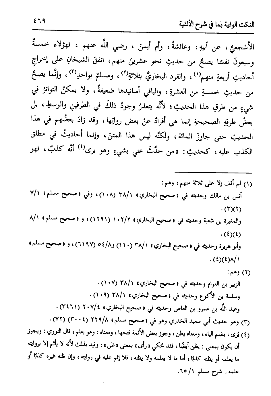 الأشجعيُّ، عن أبيهِ، وعائشةَ، وأم أيمنَ - رضي الله عنهم - فهؤلاء خمسةٌ وسبعونَ نفساً يصحُ من حديثِ نحو عشرينَ منهم، اتفقَ الشيخانِ على إخراجِ أحاديثِ أربعةً منهم (¬1)، وانفرد البخاريُّ بثلاثةٍ (¬2)، ومسلمٌ بواحدٍ (¬3)، وإنَّما يصحُ من حديثِ خمسةٍ من العشرةِ، والباقي أسانيدها ضعيفةٌ، ولا يمكنُ التواترُ في شيءٍ من طرقِ هذا الحديثِ؛ لأنَّه يتعذرُ وجودُ ذلكَ في الطرفينِ والوسطِ، بل بعضُ طرقِهِ الصحيحةِ، إنما هي أفرادٌ عنْ بعض رواتِها، وقد زادَ بعضُهم في هذا الحديثِ حتى جاوزَ المئة، ولكنَّه ليس هذا المتنَ، وإنما أحاديثُ في مطلق الكذب عليه، كحديثِ: ((من حدَّثَ عني بشيءٍ، وهو يرى (¬4) أنَّه كذبٌ، فهو
