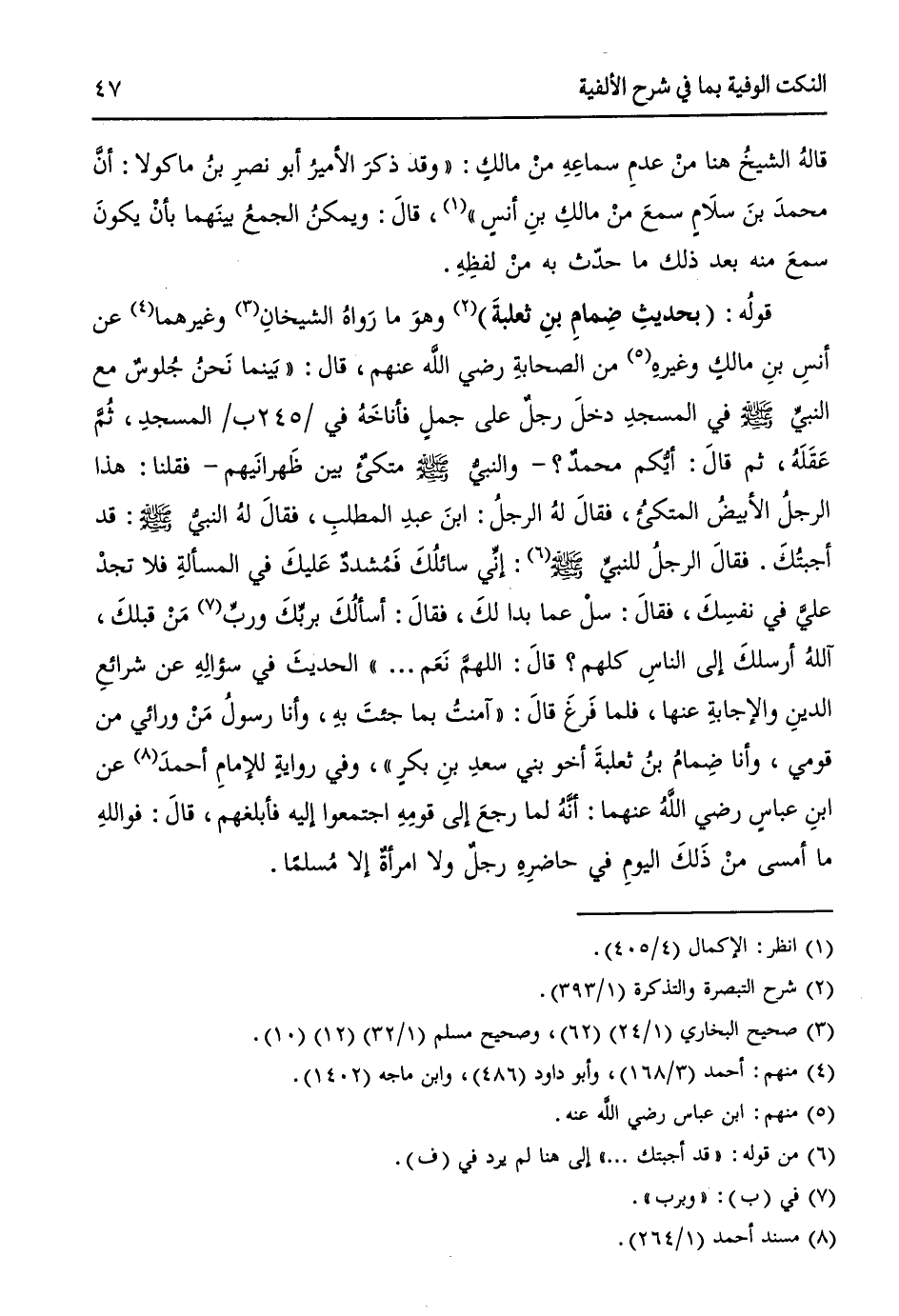 قولهُ: (بحديثِ ضِمامِ بنِ ثعلبةَ) (¬2) وهوَ ما رَواهُ الشيخانِ (¬3) وغيرهما (¬4) عن أنسِ بنِ مالكٍ، وغيرهِ (¬5) من الصحابة - رضي الله عنهم -، قال: ((بَينما نَحنُ جُلوسٌ مع النبيِّ - صلى الله عليه وسلم - في المسجدِ دخلَ رجلٌ على جملٍ فأناخَهُ في /245 ب/ المسجدِ، ثُمّ عَقَلَهُ، ثم قالَ: أيُّكم محمدٌ؟ - والنبيُّ - صلى الله عليه وسلم - متكئٌ بين ظَهرانيهم - فقلنا: هذا الرجلُ الأبيضُ المتكئُ، فقالَ لهُ الرجلُ: ابنُ عبدِ المطلبِ، فقالَ لهُ النبيُّ - صلى الله عليه وسلم -: قد أجبتُكَ، فقالَ الرجلُ للنبيِّ - صلى الله عليه وسلم - (¬6): إنِّي سائلُكَ فَمُشددٌ عَليكَ في المسألةِ فلا تجدْ عليَّ في نفسِكَ، فقالَ: سلْ عما بدا لكَ، فقالَ: أسألُكَ بربِّكَ وربِّ (¬7) مَنْ قبلكَ آللهُ أرسلكَ إلى الناسِ كلهم؟ قالَ: اللهمَّ نَعَم ... )) الحديثَ في سؤالِهِ عن شرائعِ الدينِ والإجابةِ عنها، فلما فَرغَ قالَ: ((آمنتُ بما جئتَ بهِ، وأنا رسولُ مَنْ ورائي من قومي وأنا ضِمامُ بنُ ثعلبةَ أخو بني سعدِ بنِ بكرٍ))، وفي روايةٍ للإمامِ أحمدَ (¬8) عن ابنِ عباسٍ رضي اللهُ عنهما: أنَّهُ لما رجعَ إلى قومِهِ اجتمعوا إليه فأبلغهم، قالَ: فواللهِ ما أمسى منْ ذَلِكَ اليومِ في حاضِرِه رجلٌ ولا امرأةٌ إلا مُسلماً.